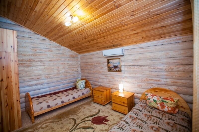 Дом на двоих. 8 домов на базе. Однокомнатный номер, рассчитан на проживание двух человек. (Тамбур. Спальня: 2 полутораспальные кровати (при желании можно соединить) прикроватные тумбочки , шкаф, Сплит-система, холодильник, чайник электр.,набор посуды, спутниковое ТВ. Санузел: душевая кабина, умывальник, WC, индивидуальные полотенца.)