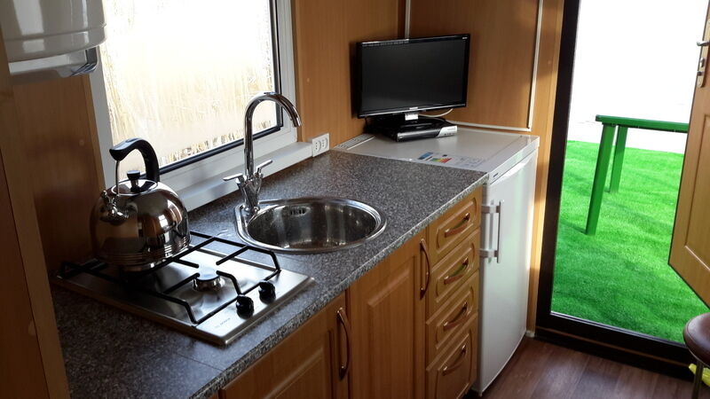 На кухне есть вся необходимая посуда. Мангал и котел бесплатно. Бесплатный Wi-Fi в каждом домике.