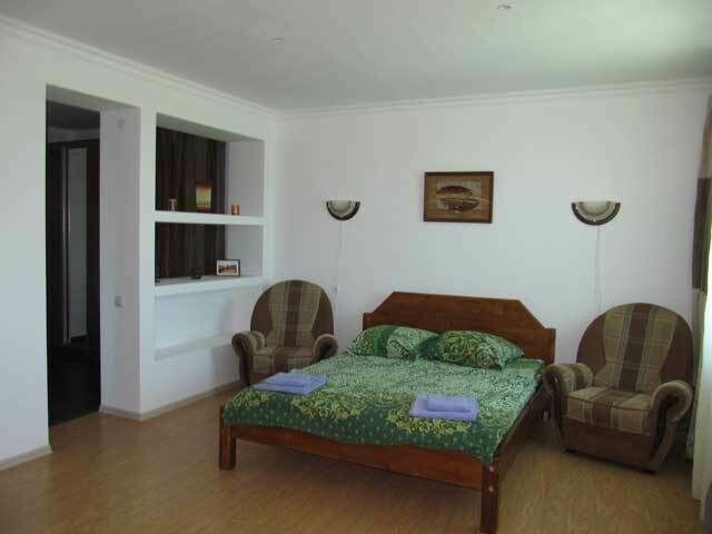 Площадь номера 45 кв.м., веранда 25 кв м. Санузел с душем и ванной, кондиционер, телевизор, холодильник, двуспальная кровать.