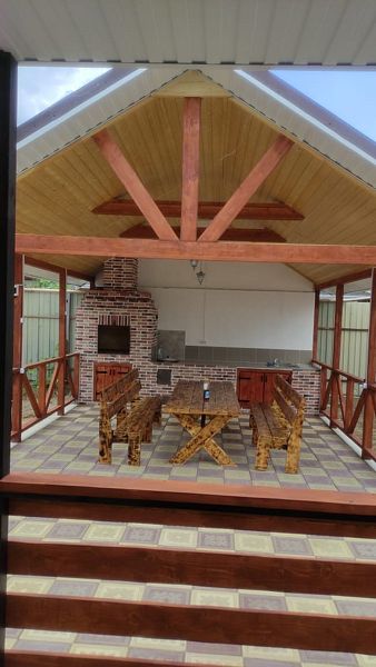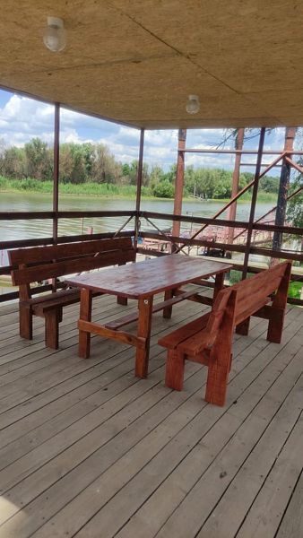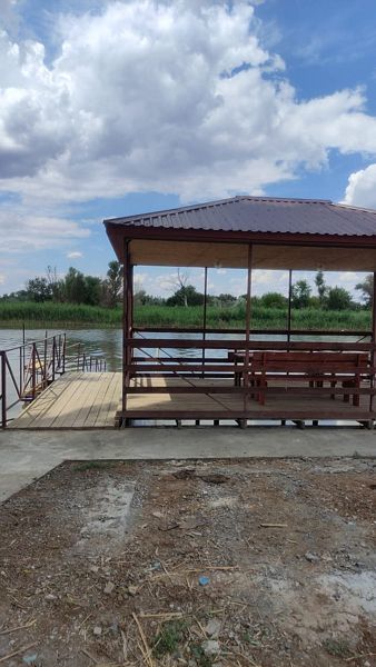 На берегу реки расположена открытая беседка со столом и лавочками, где можно отдохнуть и насладиться панорамным видом на реку.