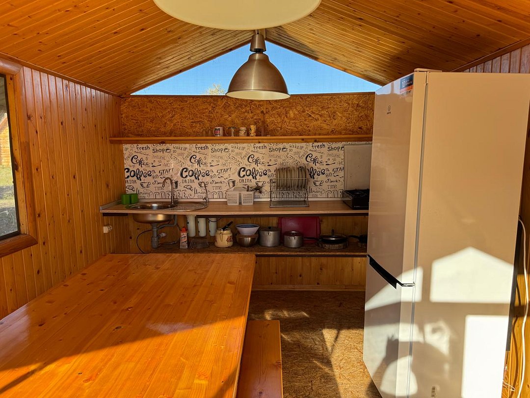 У каждого домика имеется собственная, полноценная, закрытая беседка: холодильник, морозильная камера, газовая плита, посуда, обеденная и мангальная зоны.
