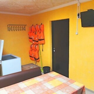 Туалетная комната в номере (унитаз, умывальник, душ, полотенцесушитель). Большие ортопедические матрасы, которые легко трансформируются в двуспальную кровать, холодильник, телевизор 32", кондиционер. У каждого номера есть свой столик в банкетном зале и на пирсе, у воды.
