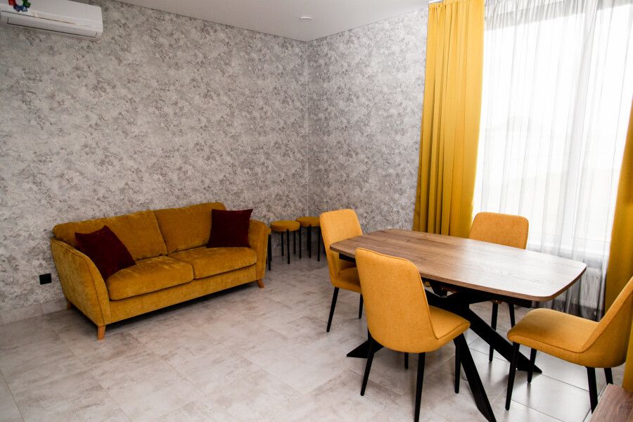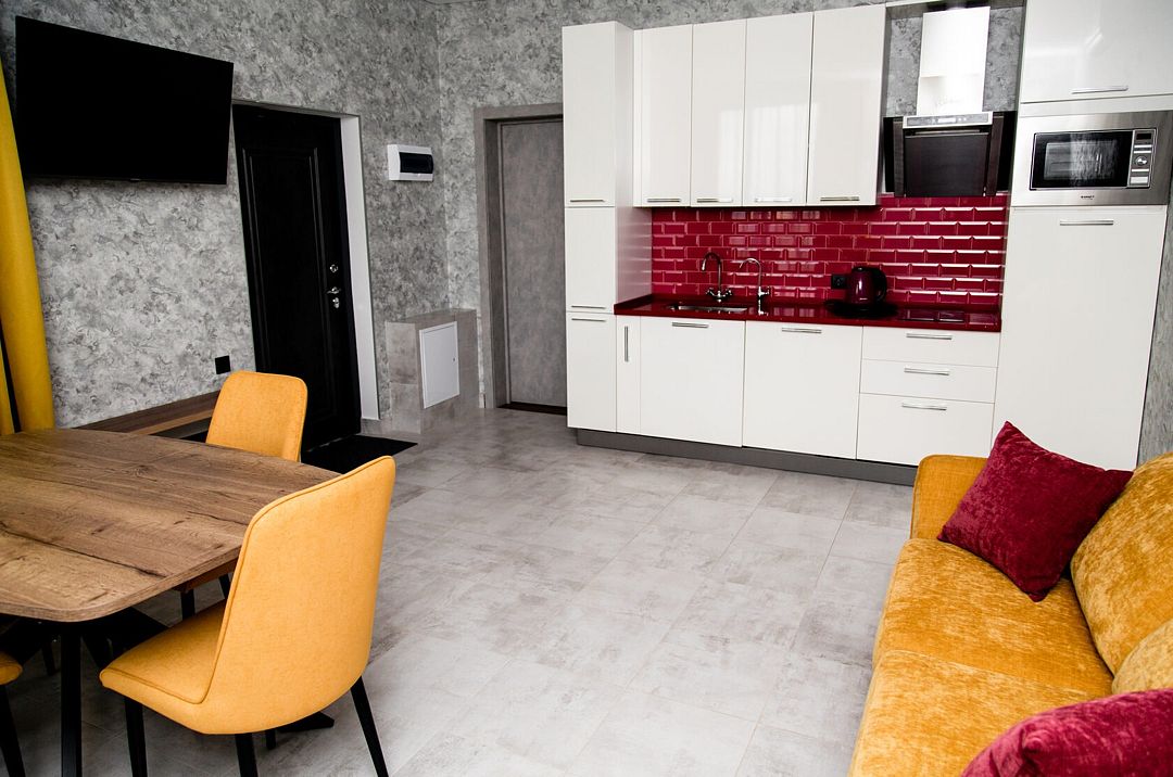 Площадь номера составляет пятьдесят квадратных метров. Две комнаты, большая двуспальная кровать (сто восемьдесят сантиметров) и двухместный диван в гостиной, оборудованная мини-кухня с плитой, холодильником и микроволновой печью, столовая зона и стиральная машина.