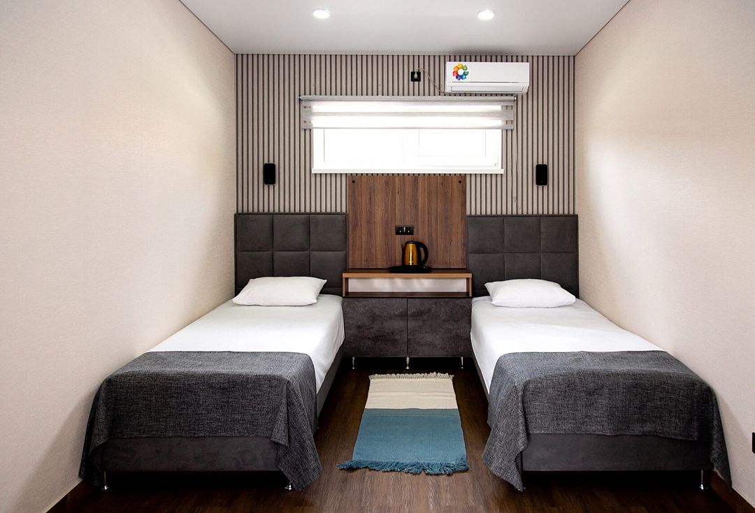 Номер оборудован двумя раздельными односпальными кроватями, ванной комнатой с душевой кабиной, чайником, кондиционером, телевизором, холодильником для напитков, постельным бельем, туалетными принадлежностями и wi-fi.