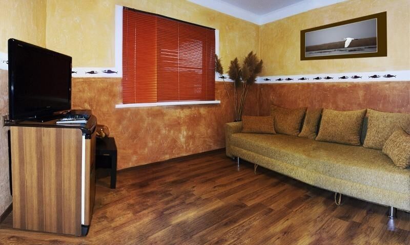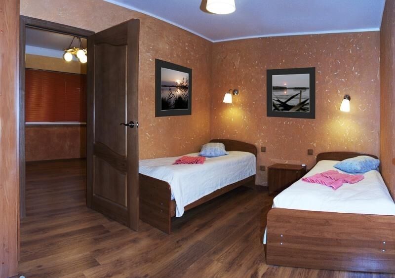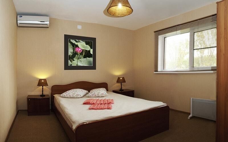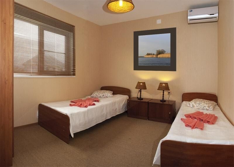 Проживания в 12 номерах коттеджей класса "А". На входе: крыльцо с навесом, оборудованное подставкой под удилища и местом для курения со скамьей. Холл: морозильная камера (для глубокой заморозки рыбы и дичи), меблированная прихожая. Гостиная: раскладывающийся диван, журнальный столик, холодильник, спутник TV,чайник с набором посуды. Спальня: две комфортные кровати (ширина 100см), прикроватная тумбочка, шкаф для одежды, кондиционер. Ванная комната с душевой.