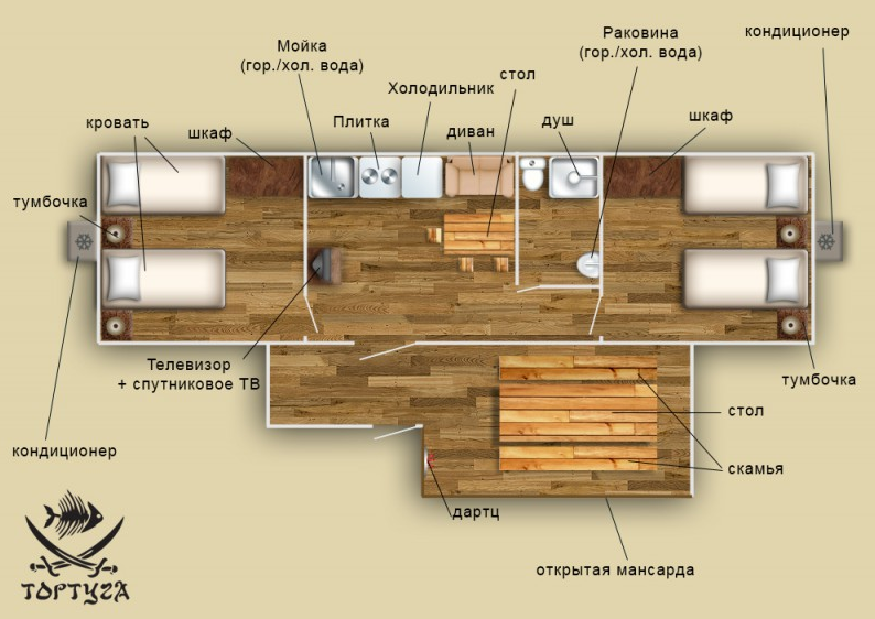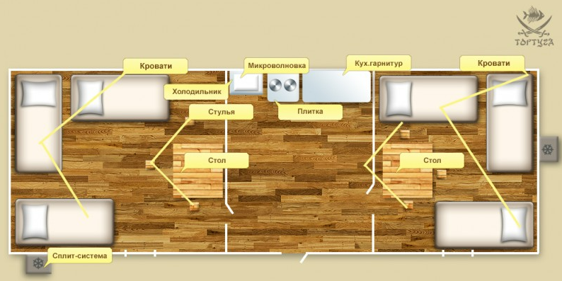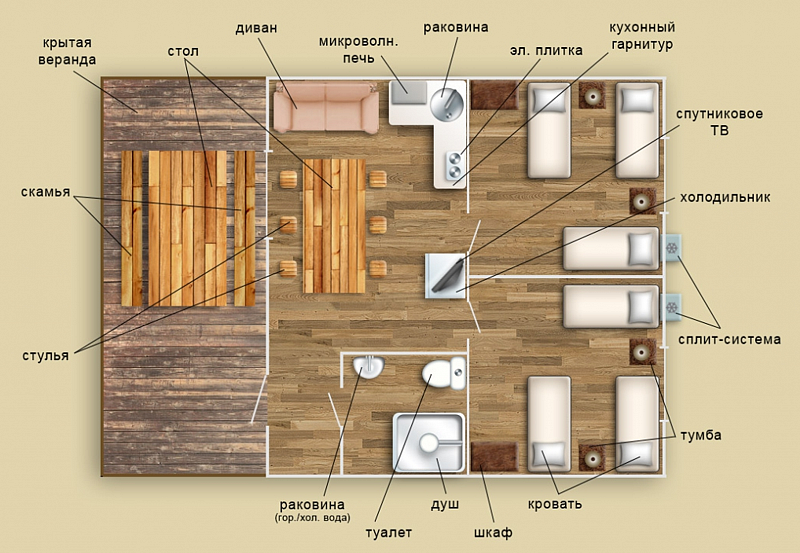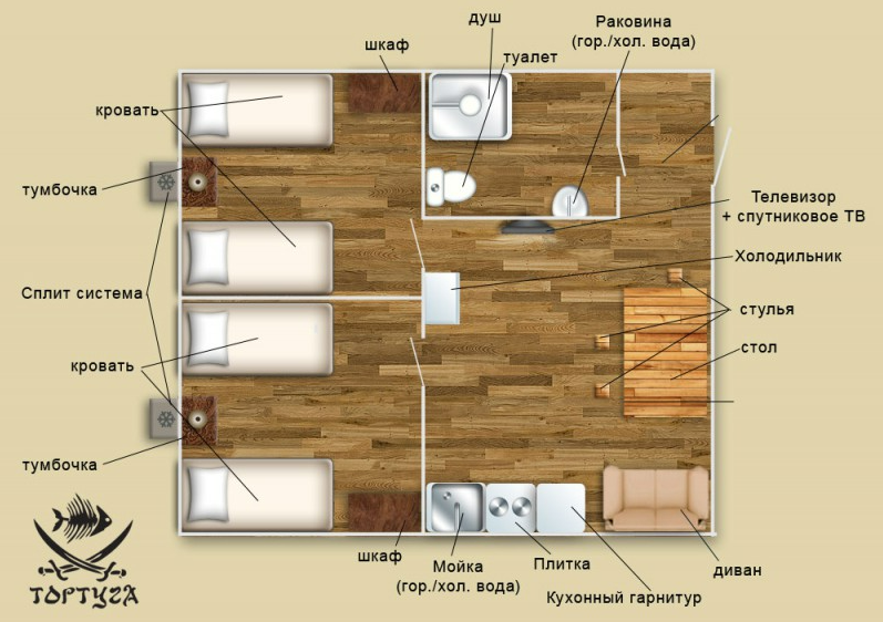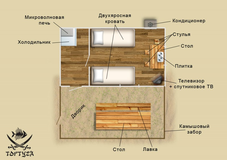 Отдельно стоящий домик состоит из двух спальных комнат, кухни, санузла (туалет, душевая) , веранды. В каждой спальне по две кровати, шкаф, прикроватные тумбочки, кондиционеры, обогреватели. Кухня оборудована необходимой посудой и эл. плитой, микроволновкой, холодильником, спутниковым ТВ, эл. чайником, диванчик.