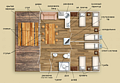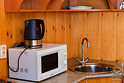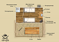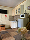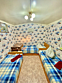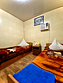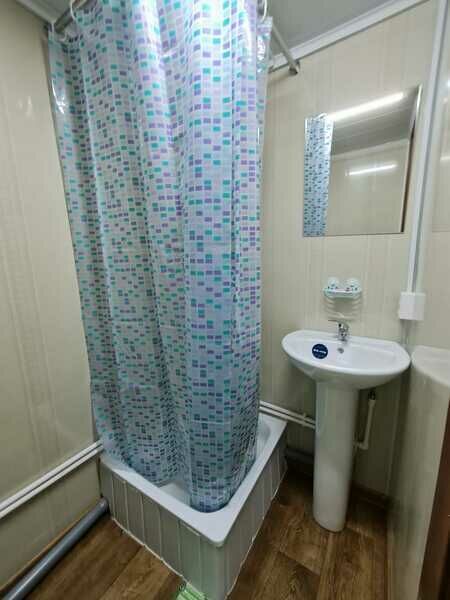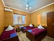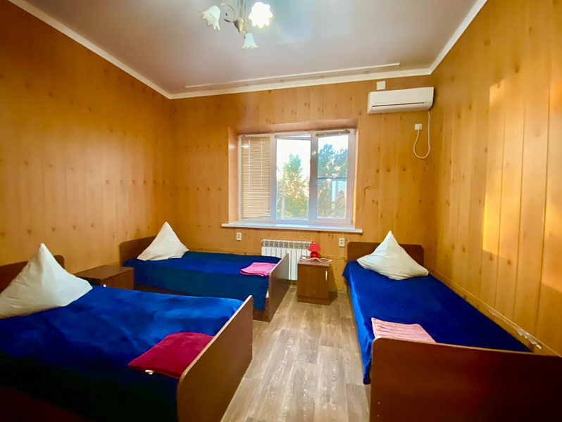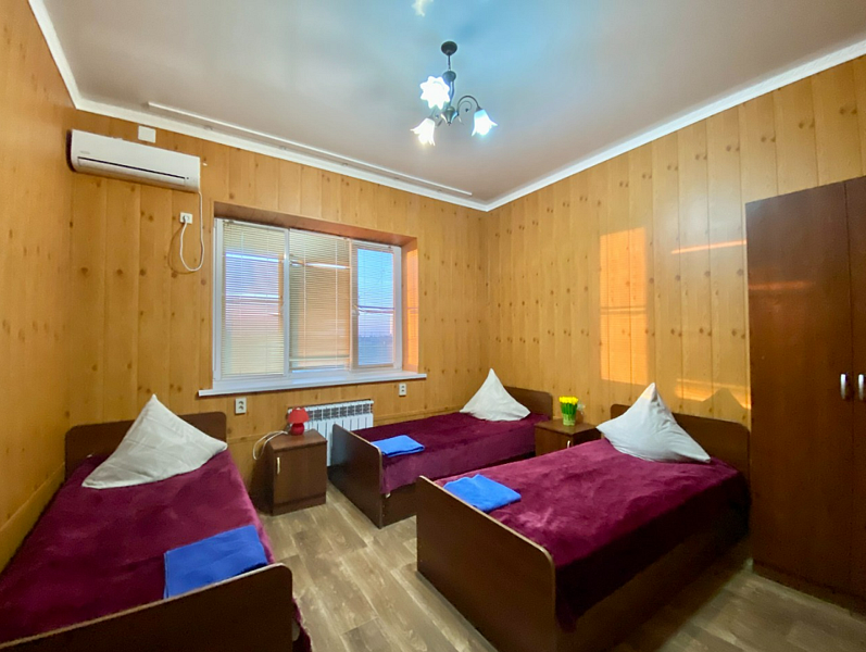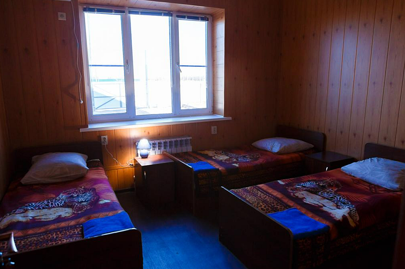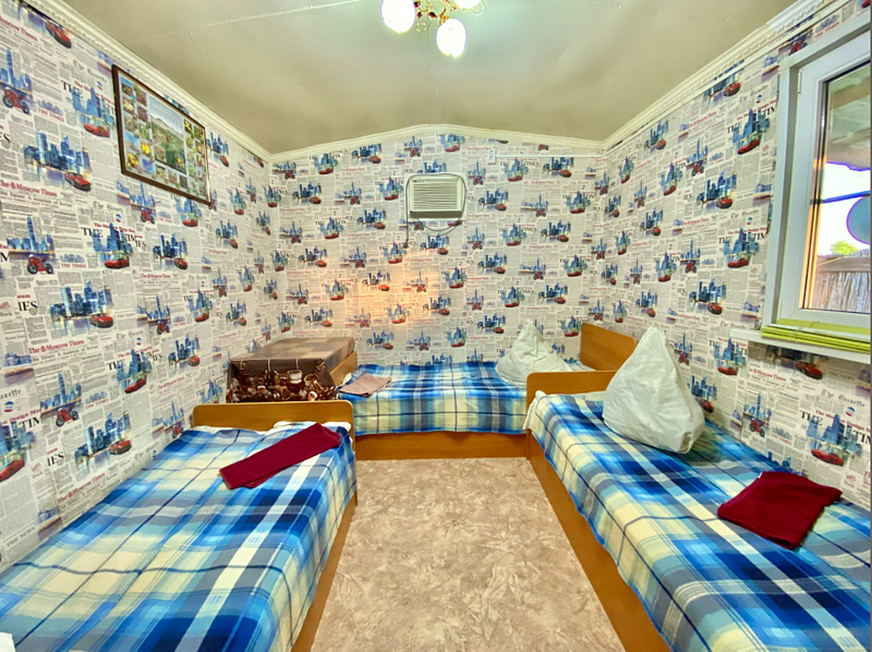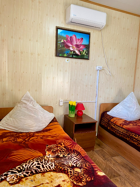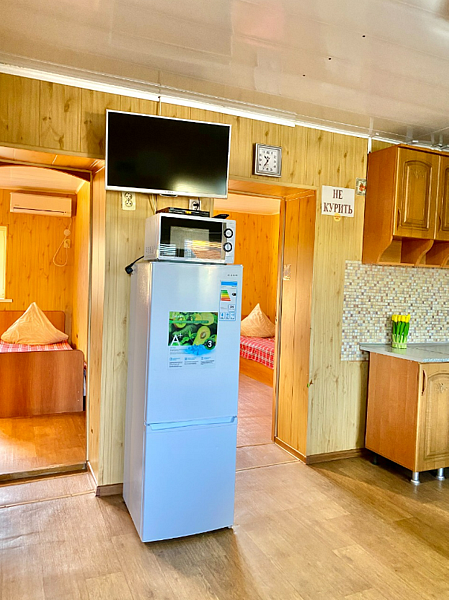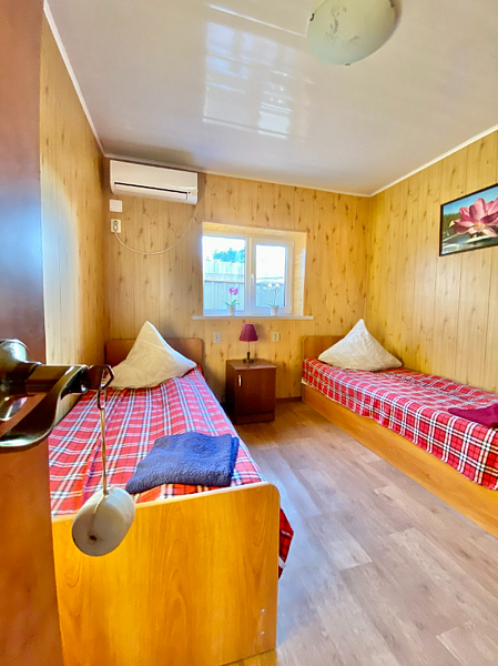 Отдельно стоящий домик. Имеет свой дворик со столом и лавками. Состоит из двух спальных комнат в каждой по три кровати обеденный стол и табуреты, кондиционер и обогреватели. Небольшая кухонька со всей необходимой посудой, эл.плитой, микроволновкой, эл.чайником холодильником.