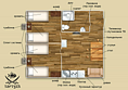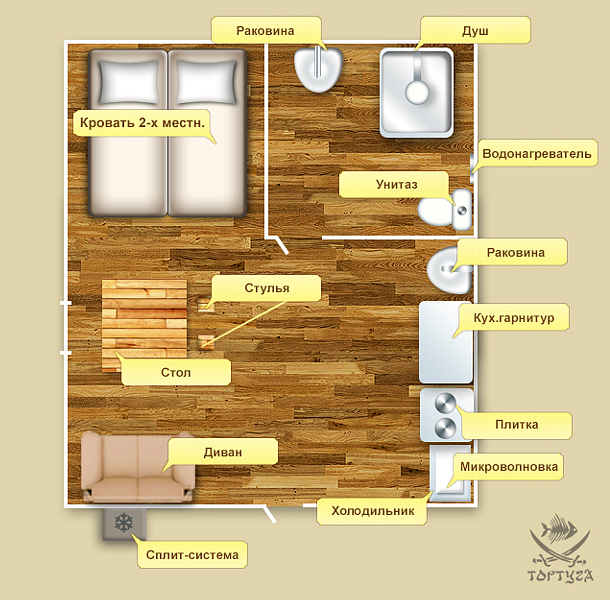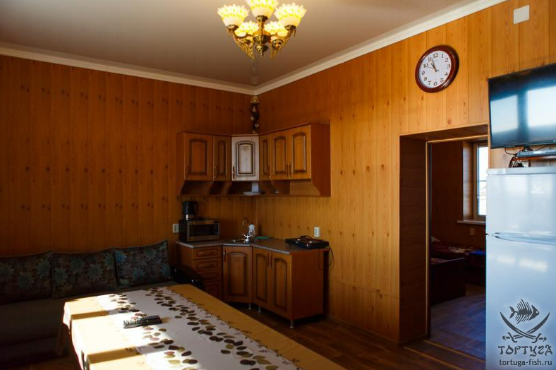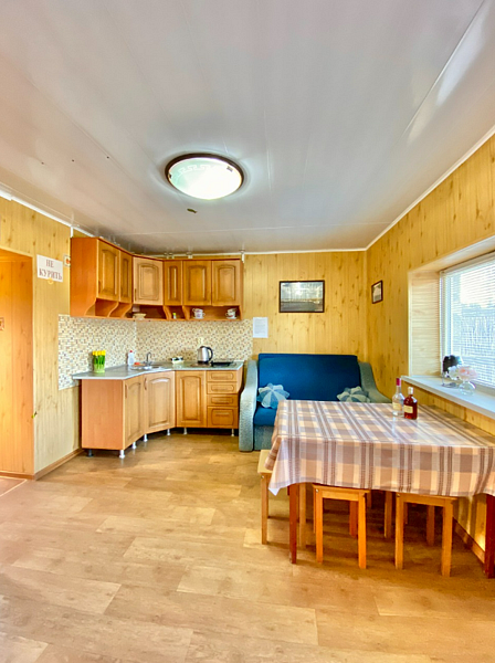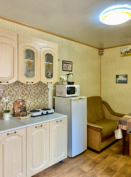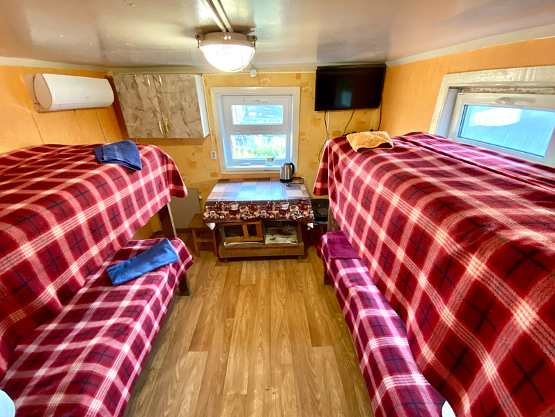 Номер с двухспальной кроватью, с раскладывающимся диванчиком. Санузел (туалет, душевая). Сплит система, обогреватели, плазма со спутниковым ТВ. Кухня: холодильник, микроволновка, эл.плита, эл.чайник, вся необходимая посуда.