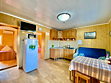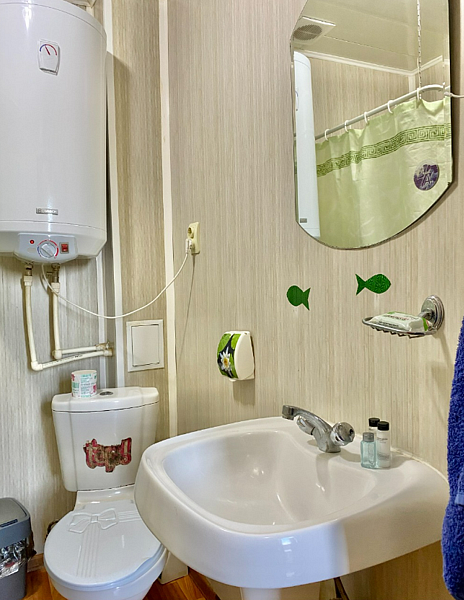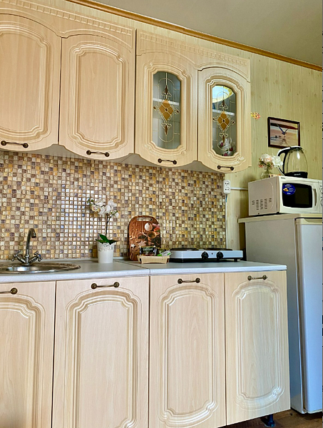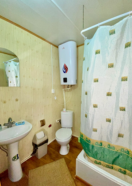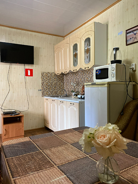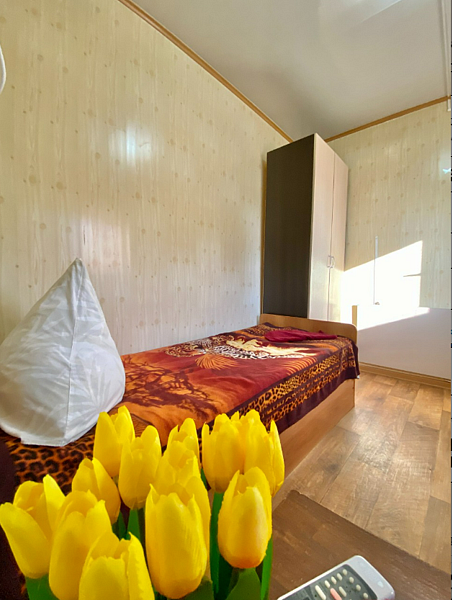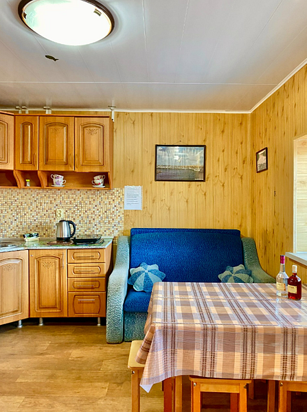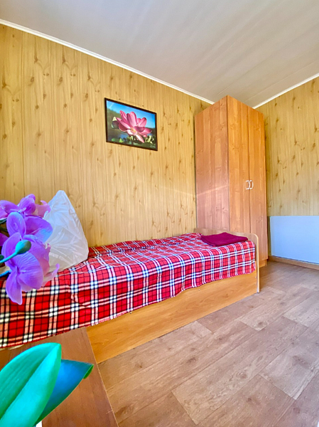 Отдельно стоящий домик, находиться близко от воды. Состоит из основной комнаты и прихожей. Имеется отдельный дворик со столом и лавками. В домике две двух ярусные кровати, стол, табуреты, эл.плита, эл.чайник, микроволновка, холодильник, телевизор со спутниковым ТВ, вся необходимая посуда.