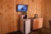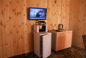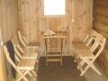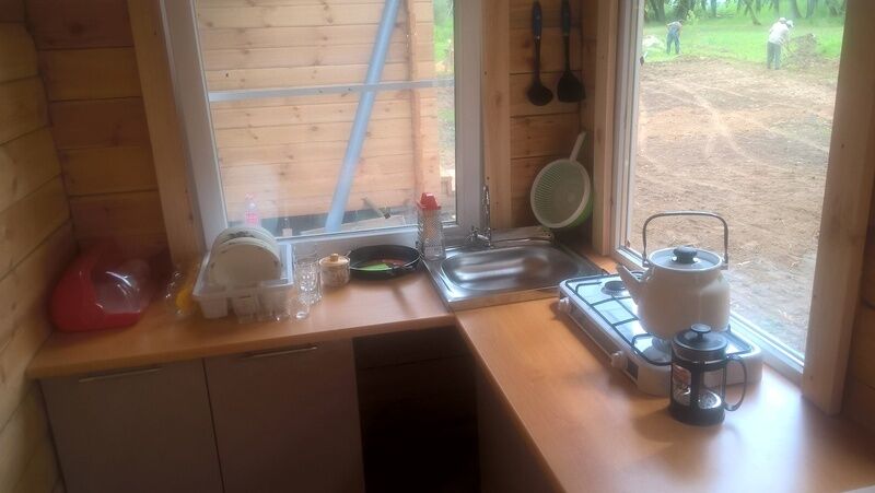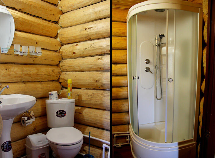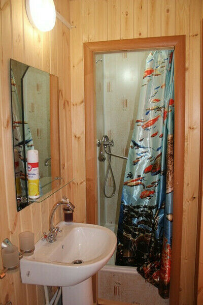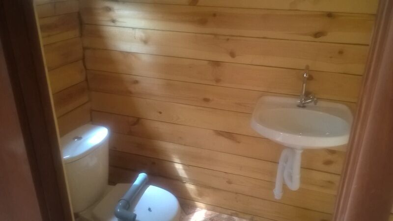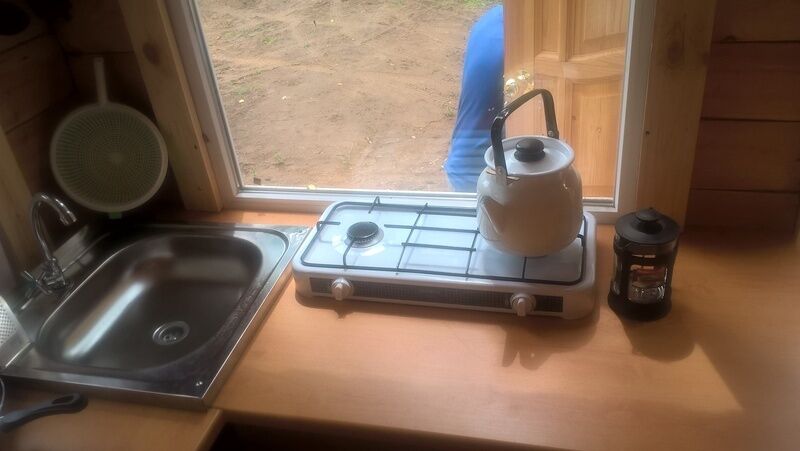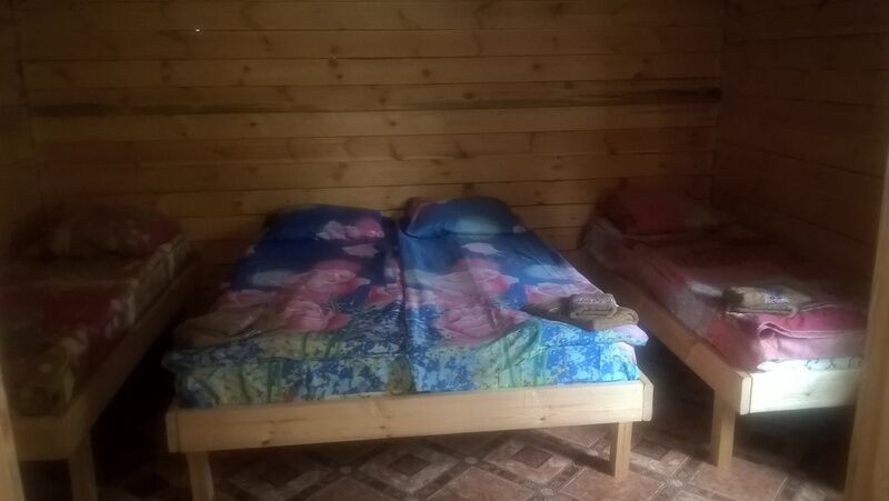 4 кровати, раковина, туалет, телевизор, сплит система (холод-тепло), кухня полностью укомплектованная посудой, двухконфорочная газовая плита, холодильник, чайник. (Душевой блок расположен отдельно, общий на 2 домика).