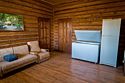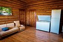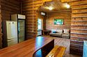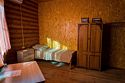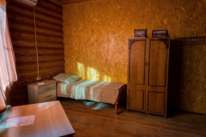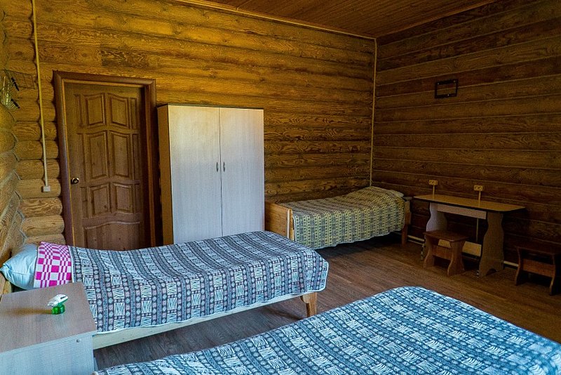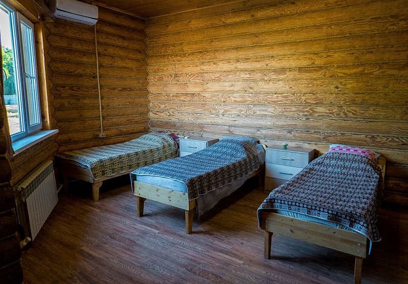 Просторный деревянный сруб в стиле русской избы. Включает в себя три номера: один двухместный и два четырёхместные (рассчитано на 10 основных мест, но в каждом номере можно поставить дополнительную кровать при необходимости).