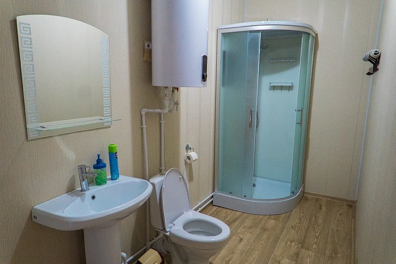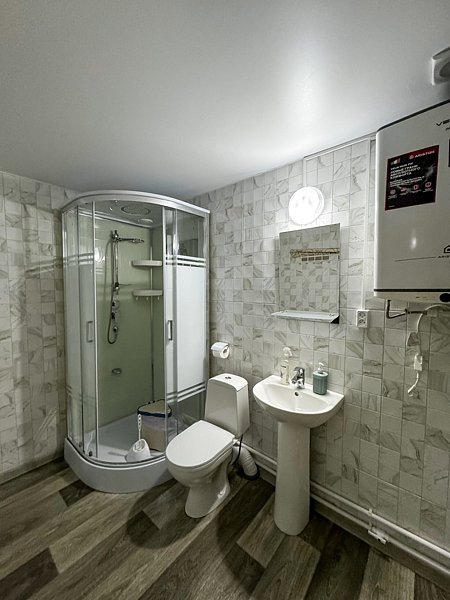 - ванная комната (2 душевые кабинки и 2 туалета) общая на три номера;