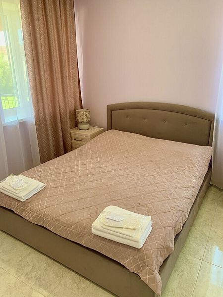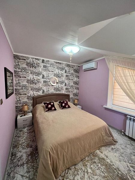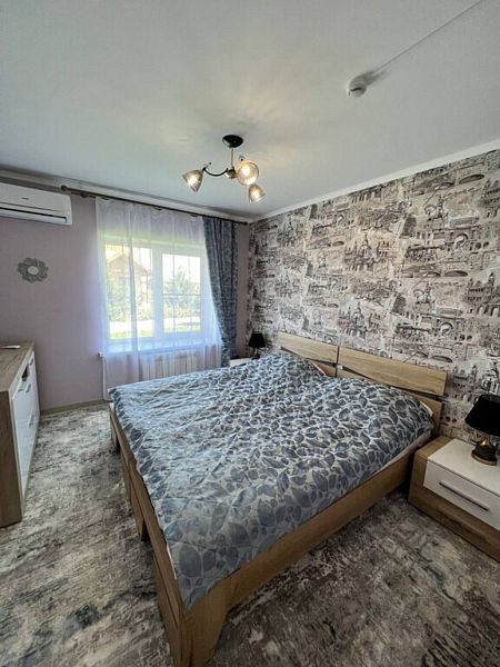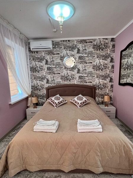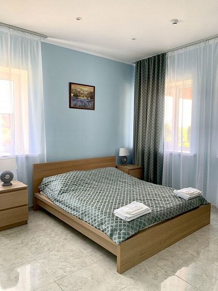 спальня – 2 односпальные кровати (или одна двухспальная), 2 тумбочки, 2 настольные лампы, сплит-система, c/у – душевая кабина, фен, набор полотенец, тапочки, шампунь, гель, мыло, зубная щетка с пастой.