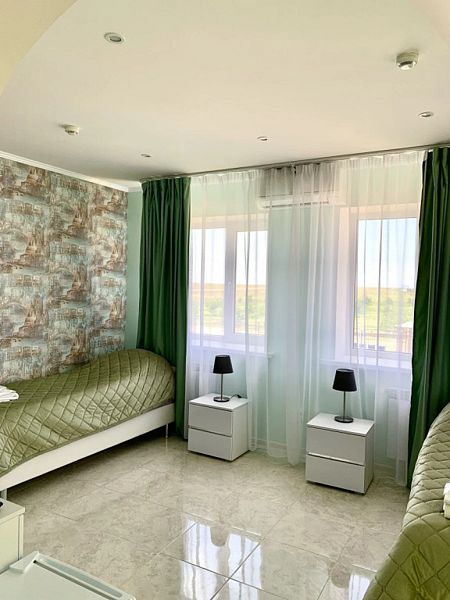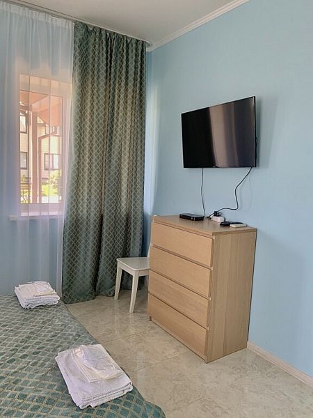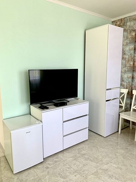 В каждом номере: гостиная — вешалка, обувница, зеркало, диван, стол, стулья, спутниковое TV, мини холодильник, комод, СВЧ, электрический чайник, кофе-машина, кухонная посуда