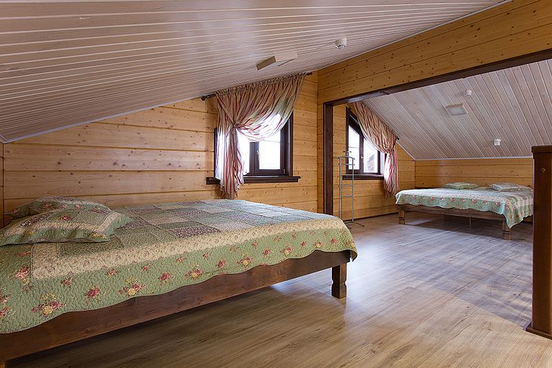 - открытая мансарда – 2 двуспальных кровати, раскладной пуф.