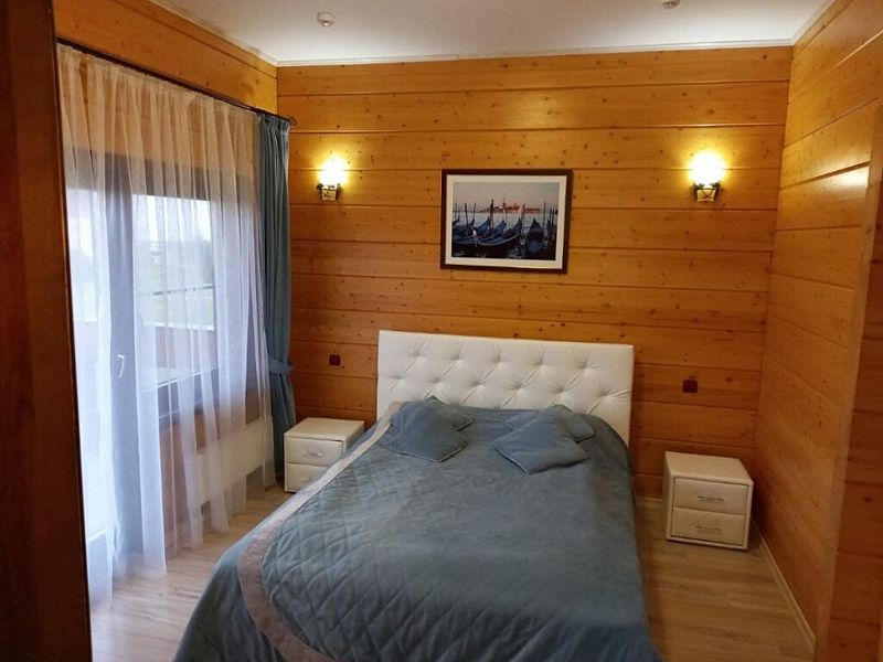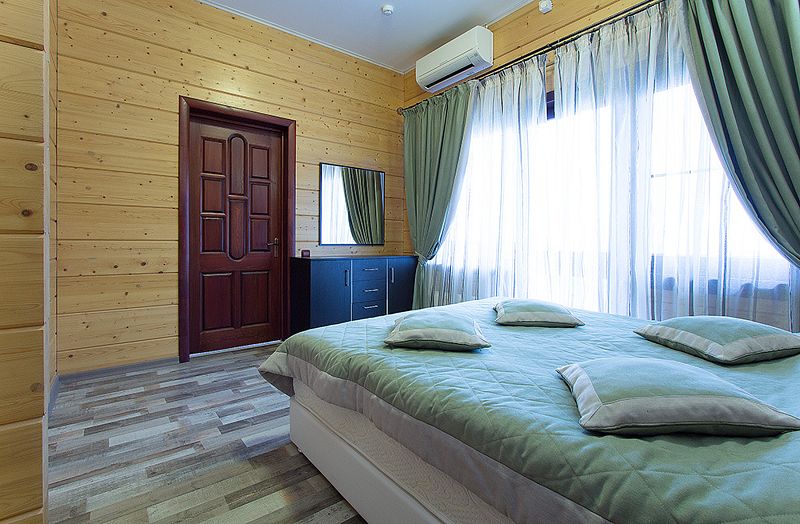 В коттедже 4 номера: 2 с двуспальной кроватью и 2 с раздельными. В каждом номере: 1 двуспальная кровать или 2 односпальные, шкаф, тумбочки, комод, небольшой холодильник, прихожая ,коридор , туалет /душ, и просторный балкон с видом на реку.