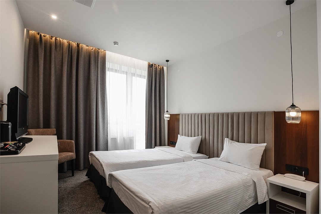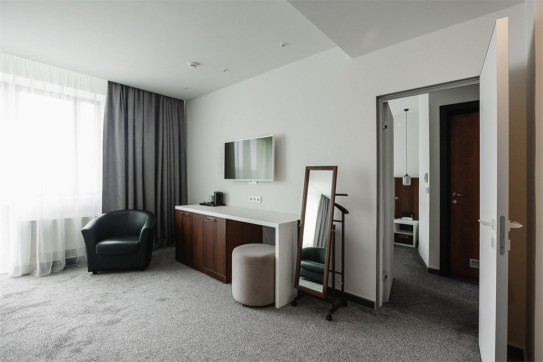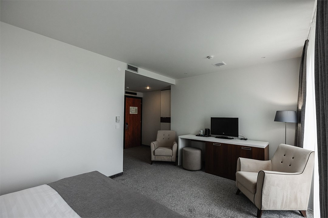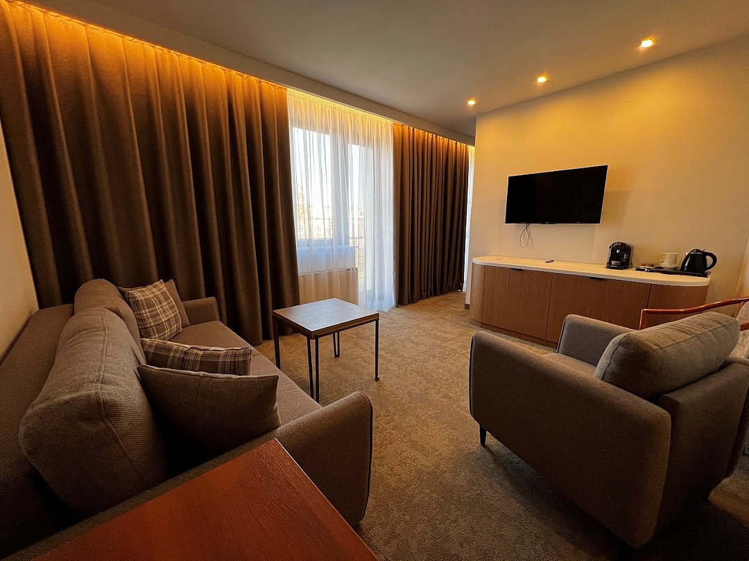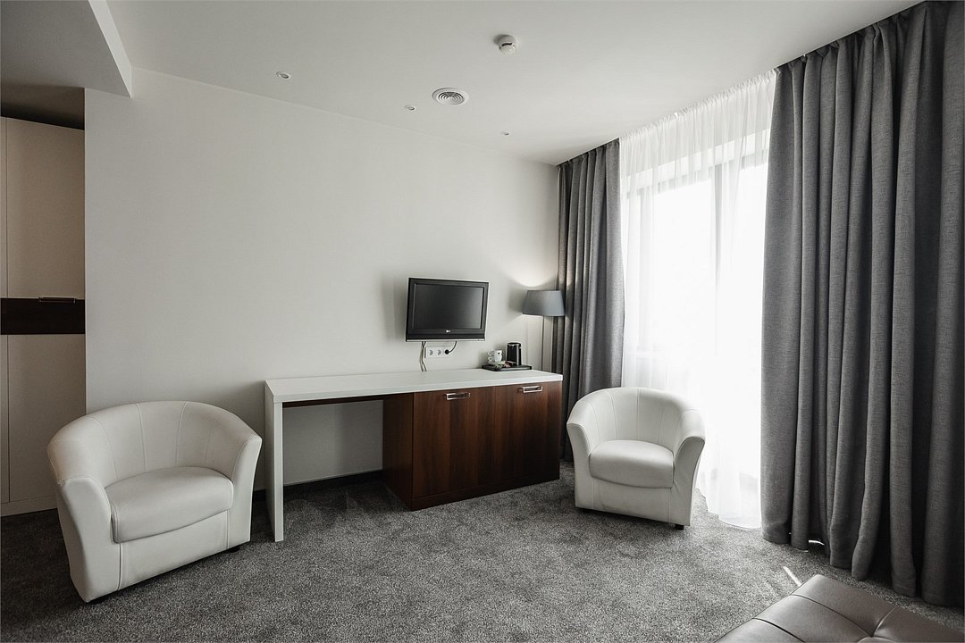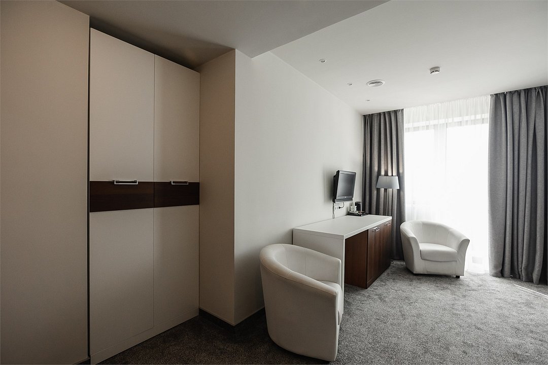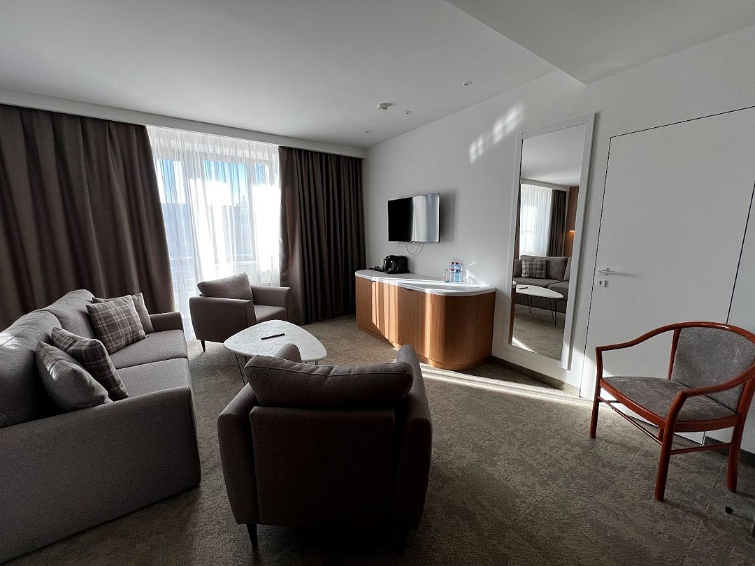 Путешествие с паройПока на 5 звезд не тянетДо 5 звёзд не дотягивает. Приехали в отель, никто не встретил, оформление быстрое. Вещи поднимали сами в номер. Номер достаточно большой, по закрытых окнах тихо. Постель хорошая, вода, чайник, минибар отсутствует, только холодильник. Сейф был закрыт , предыдущими постояльцами, но мы его и не просили открыть. Бери и уноси. Халаты , тапочки, хороший , полный косметический набор. Хорошая уборка, да и весь персонал отзывчивый и дружелюбный.завтрак в целом неплохой , но в пчтизвездочниках всегда есть красная рыба и шампанское на завтрак, хотя бы в выходные. Что не понравилось, ремонт проводился на скорую руку, кое где уже плитках отваливалась , как и ограничители дверей. Про сейф я уже говорил , одна балконная дверь просто была завернула шурупом. , телевизор практически не работал. Что еще, мы останавливались в входные и отель превращался в филиал дворца бракосочетания, который находится недалеко. Свадьбы особо не досажали , тем более в 23.00 все разбегались. А вот проведение флаер шоу, могло принести неприятности как гостям свадьбы, так как не соблюдались расстояния до выступающих, так и самому отелю с гостями, особо серьезных средств пожаротушения я не заметил, тем более взвешенные частицы от некоторых веществ фаре шоу долетали до 6 этажа и как дождик стучали в окно, да и запах исходил от этого шоу не очень приятный.