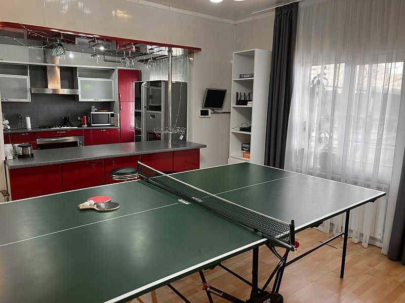 Коттедж оснащен всем необходимым для комфортного отдыха. В вашем распоряжении 4 отдельные спальни, просторная кухня-гостиная, сауна и застеклённый балкон. Есть зона для игры в настольный теннис. Также для отдыха предусмотрено массажное кресло и настольные игры. Также имеется кондиционер, телевизор и музыкальный центр.