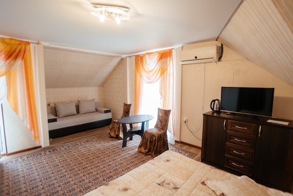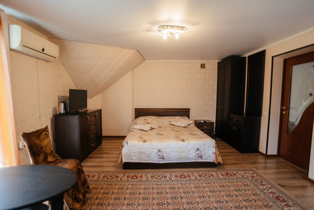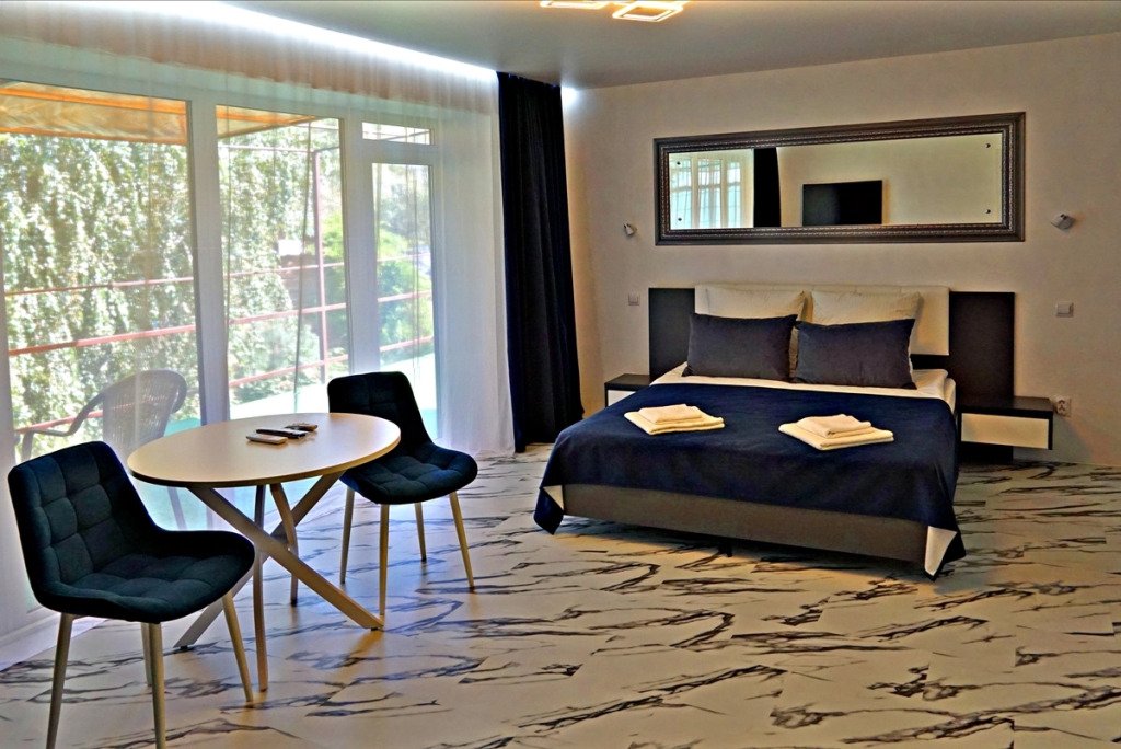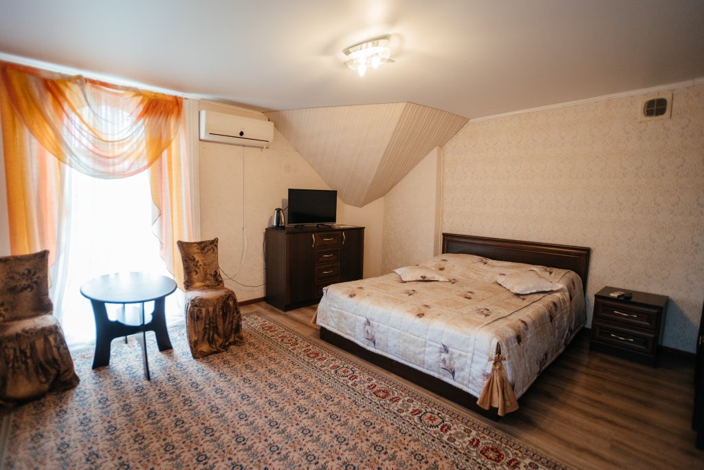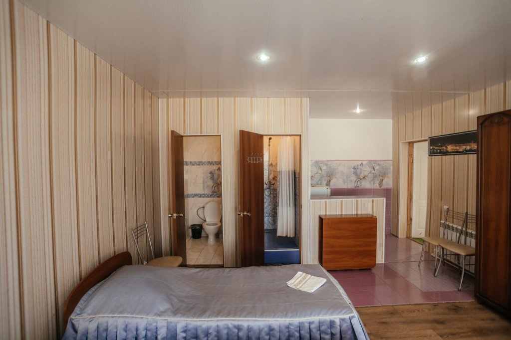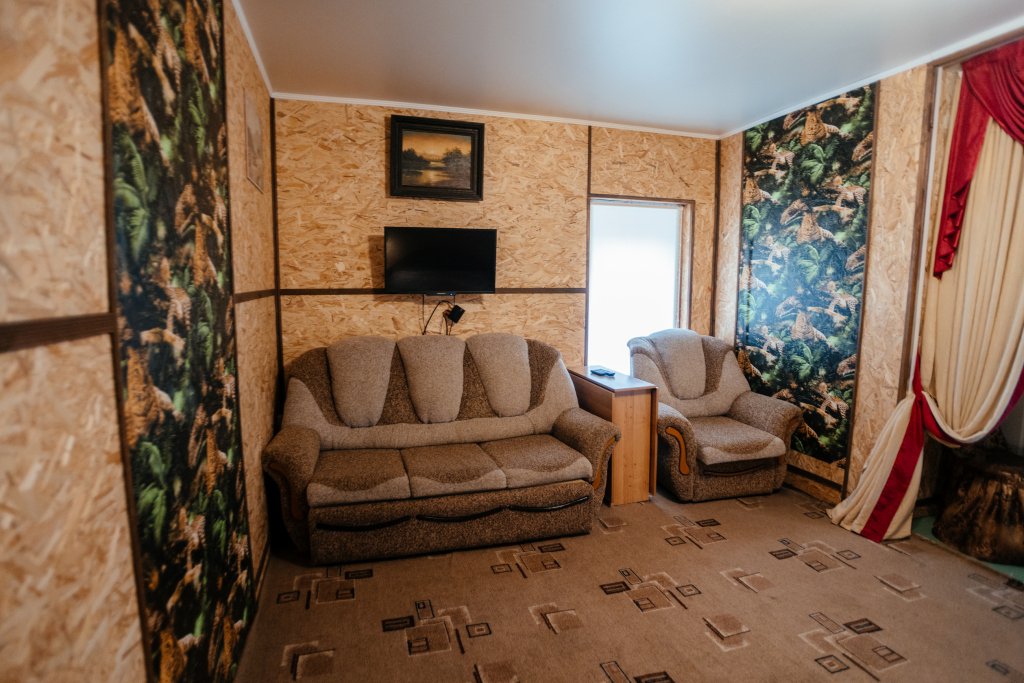 Двухместный двухкомнатный номер с двуспальной кроватью и лаундж-зоной . В номере индивидуальный санузел, сплит-система, джакузи. Номер оснащен холодильником, телевизором, чайником. Имеется свой дворик. Идеально подходит для пары.