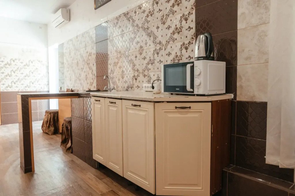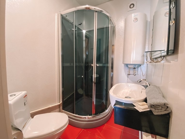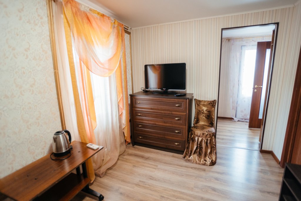 В номере три полутороспальные кровати, один раскладной полутороспальный диван. Санузел в номере, чайник, микроволновая печь, мини-холодильник
