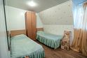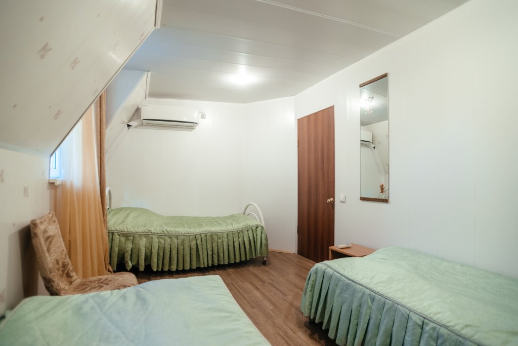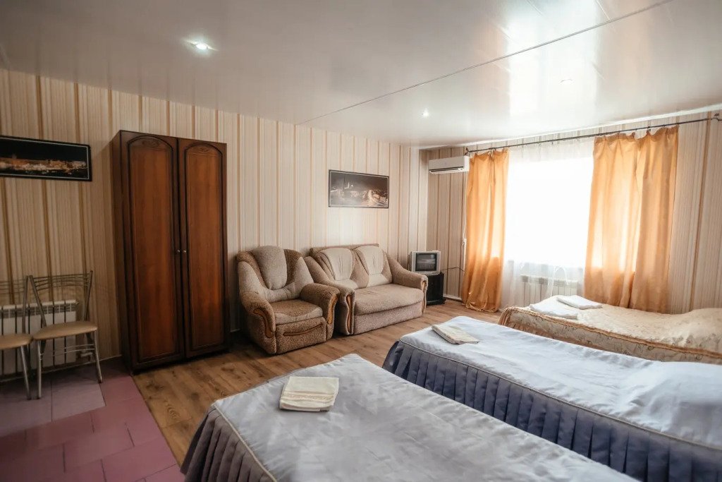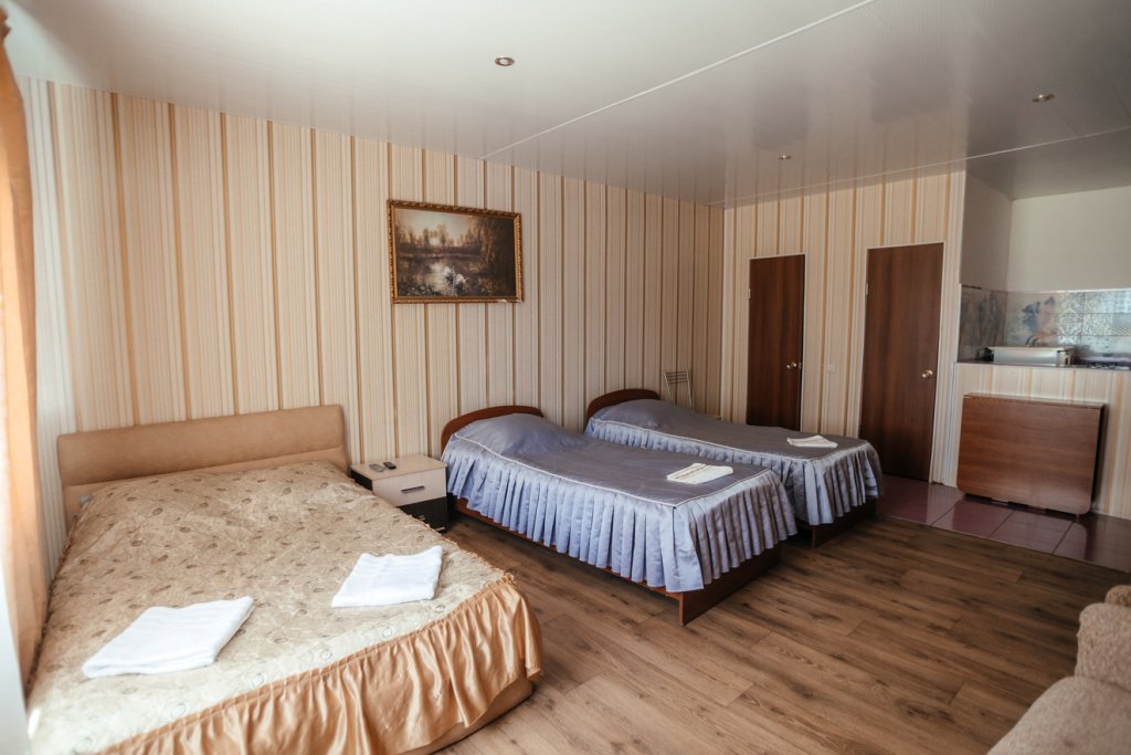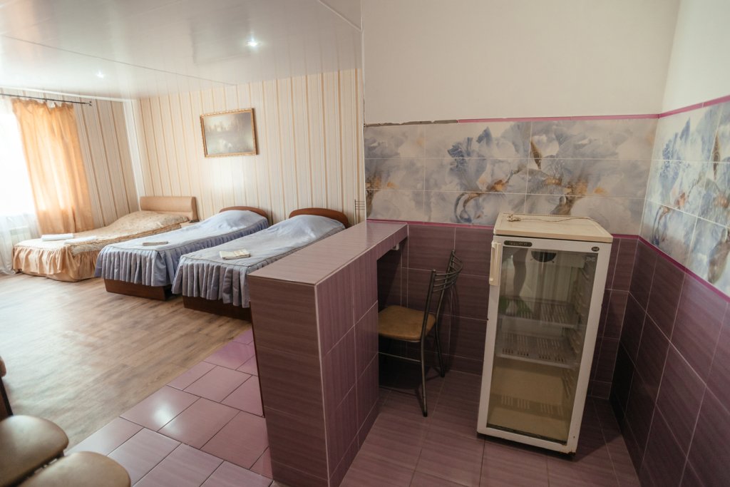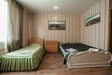 Трехместный просторный номер с одной двуспальной кроватью и двумя односпальными кроватями. В номере индивидуальный санузел, сплит-система. Номер оснащен холодильником, телевизором, чайником.