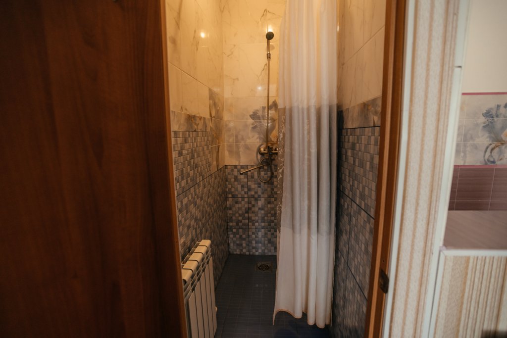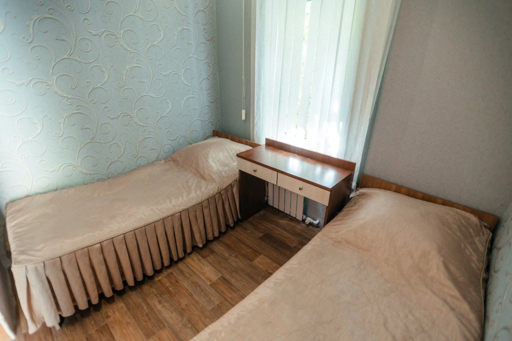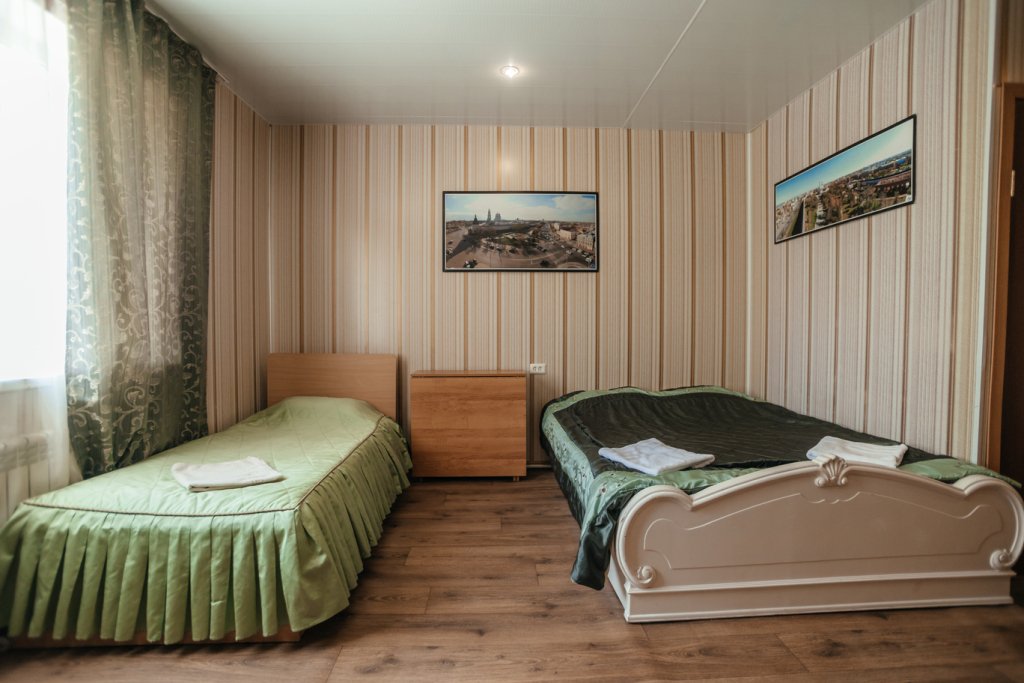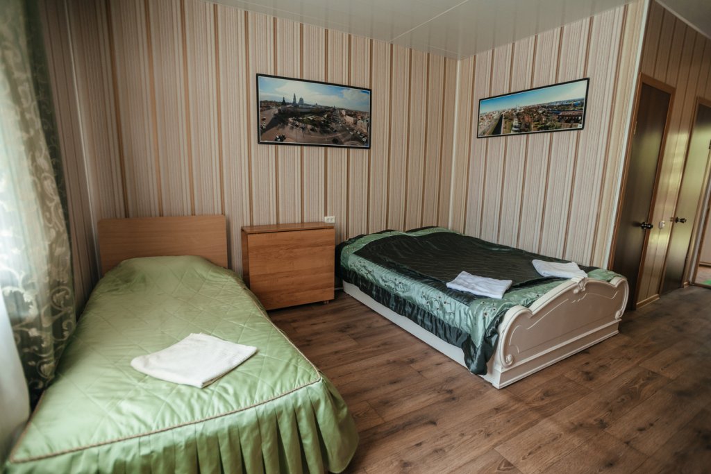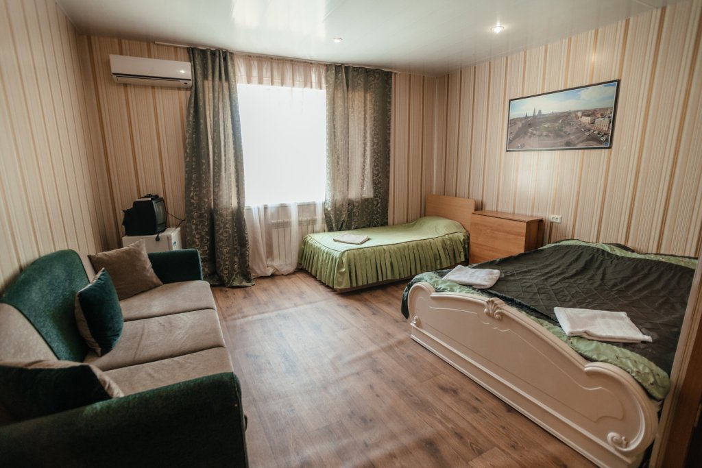 Трехместный просторный номер с одной двуспальной кроватью и двумя односпальными кроватями. В номере индивидуальный санузел, сплит-система. Номер оснащен холодильником, телевизором, чайником.