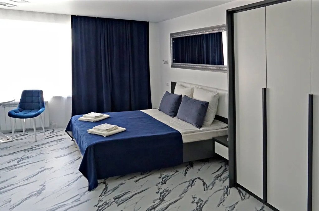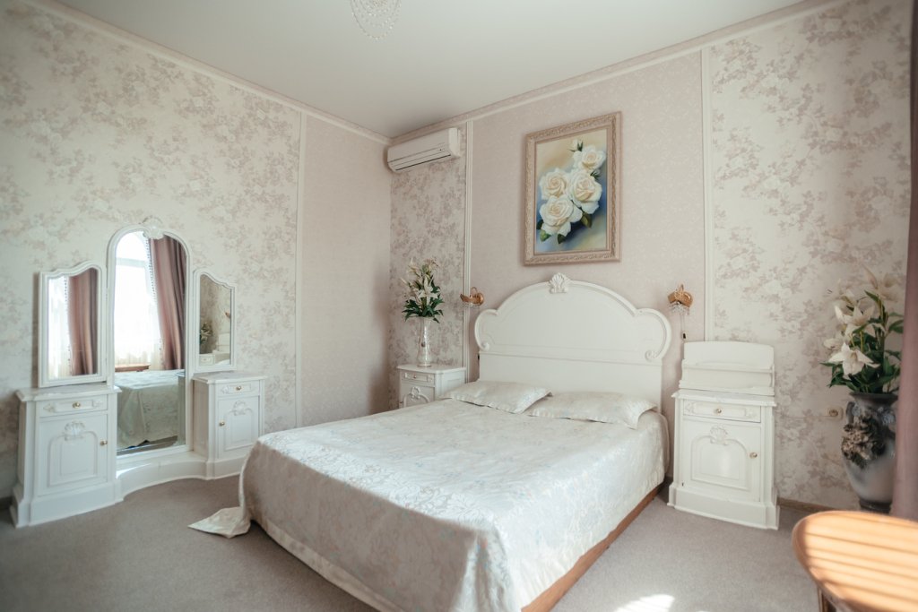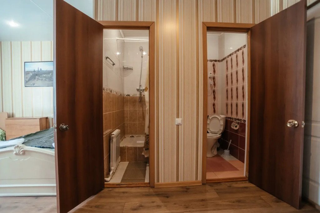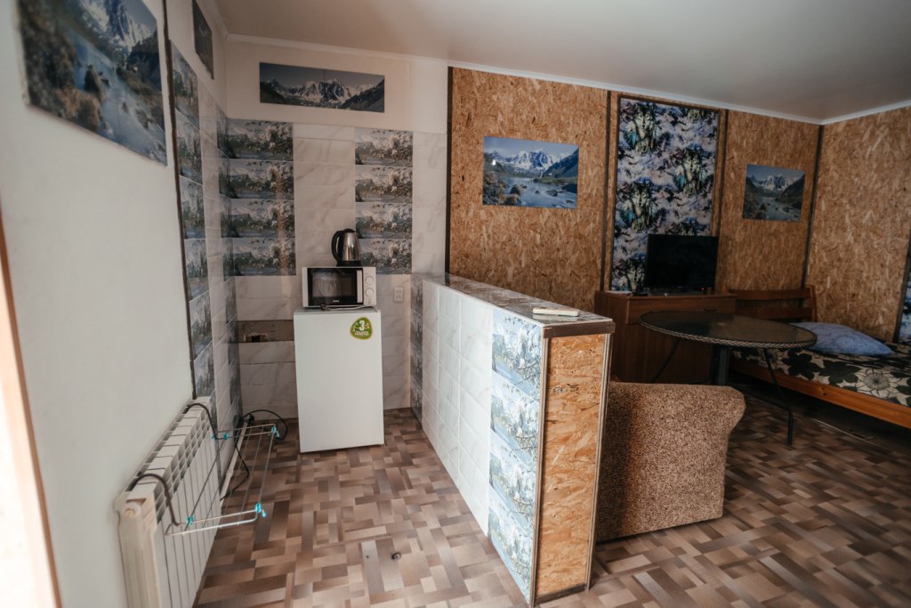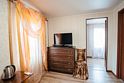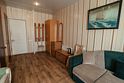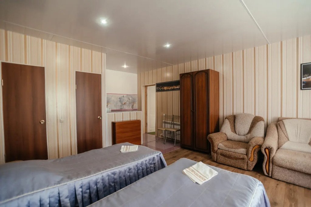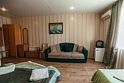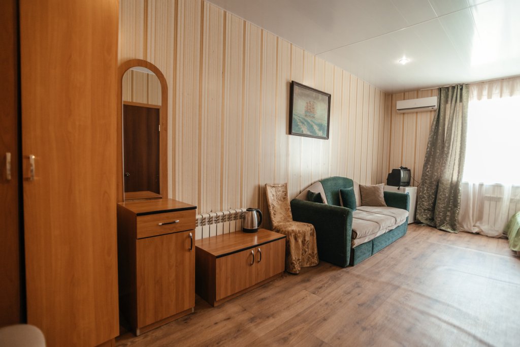 Двухместный просторный номер с одной двуспальной кроватью и раскладным двуспальным диваном. В номере индивидуальный санузел, сплит-система. Номер оснащен холодильником, телевизором, чайником, микроволновой печью.