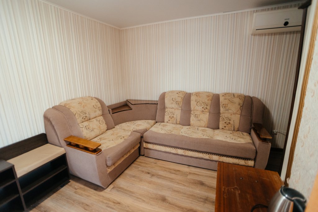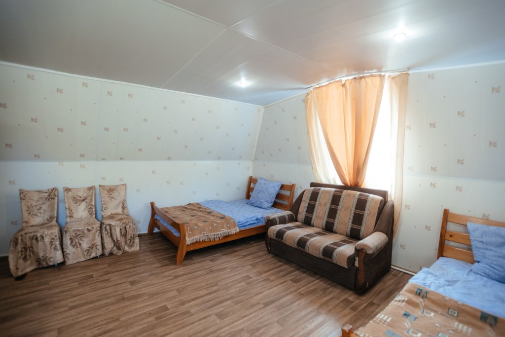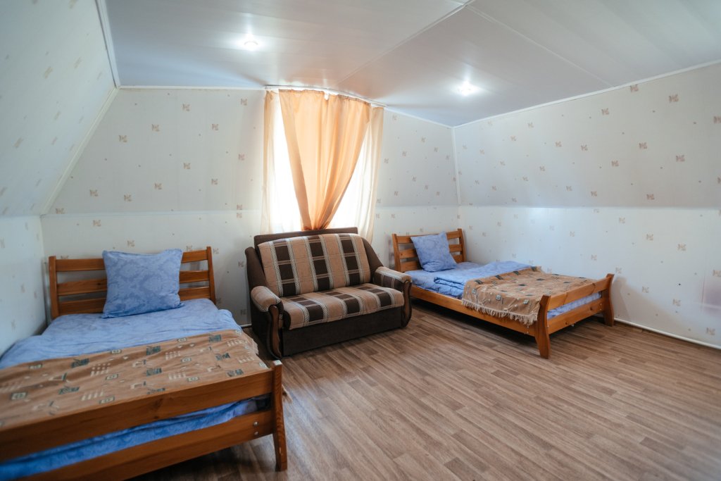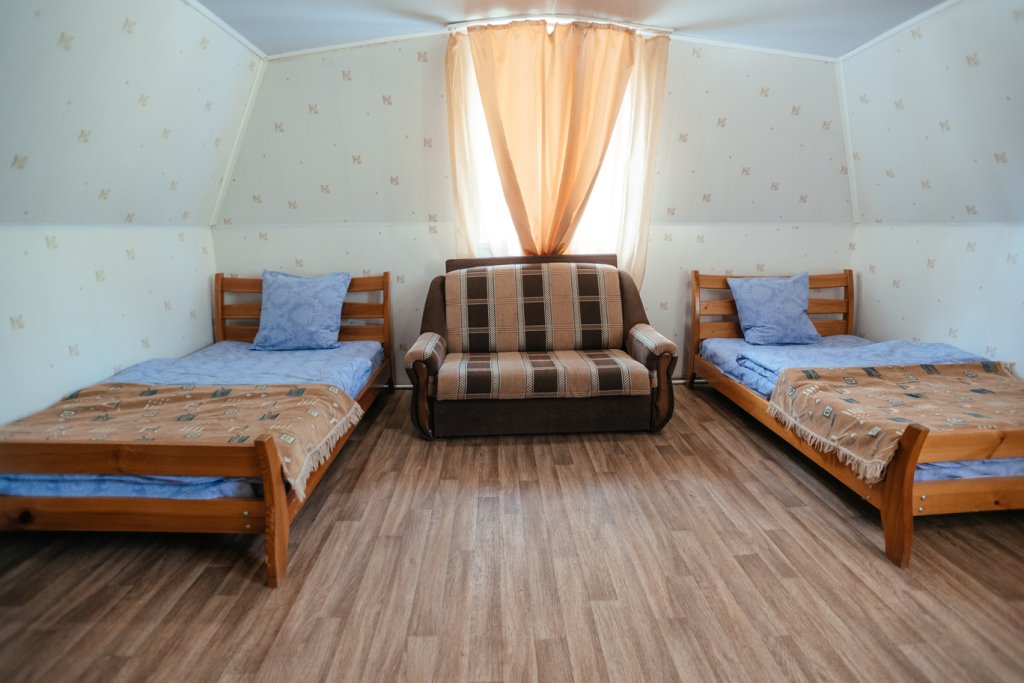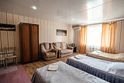 Четырехместный просторный номер с тремя полутороспальными кроватями и раскладным полутороспальным диваном. В номере индивидуальный санузел, сплит-система. Номер оснащен холодильником, телевизором, чайником, микроволновой печью.