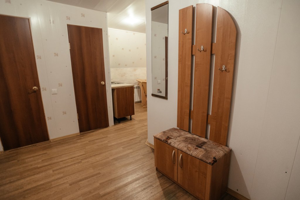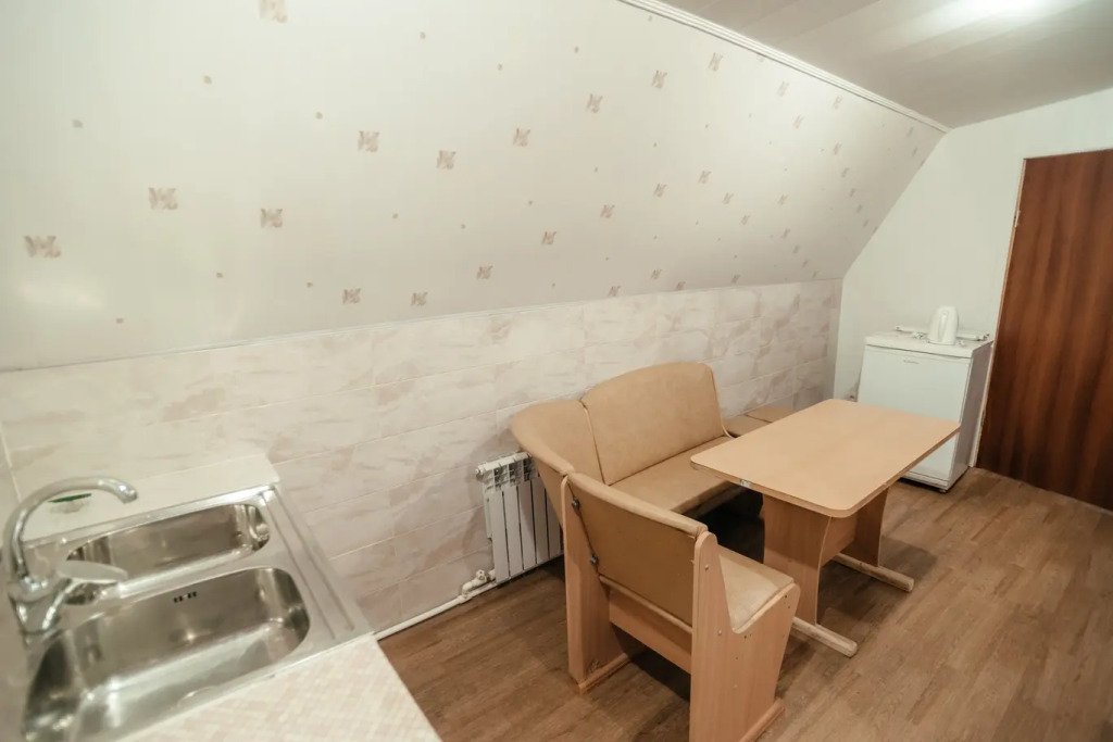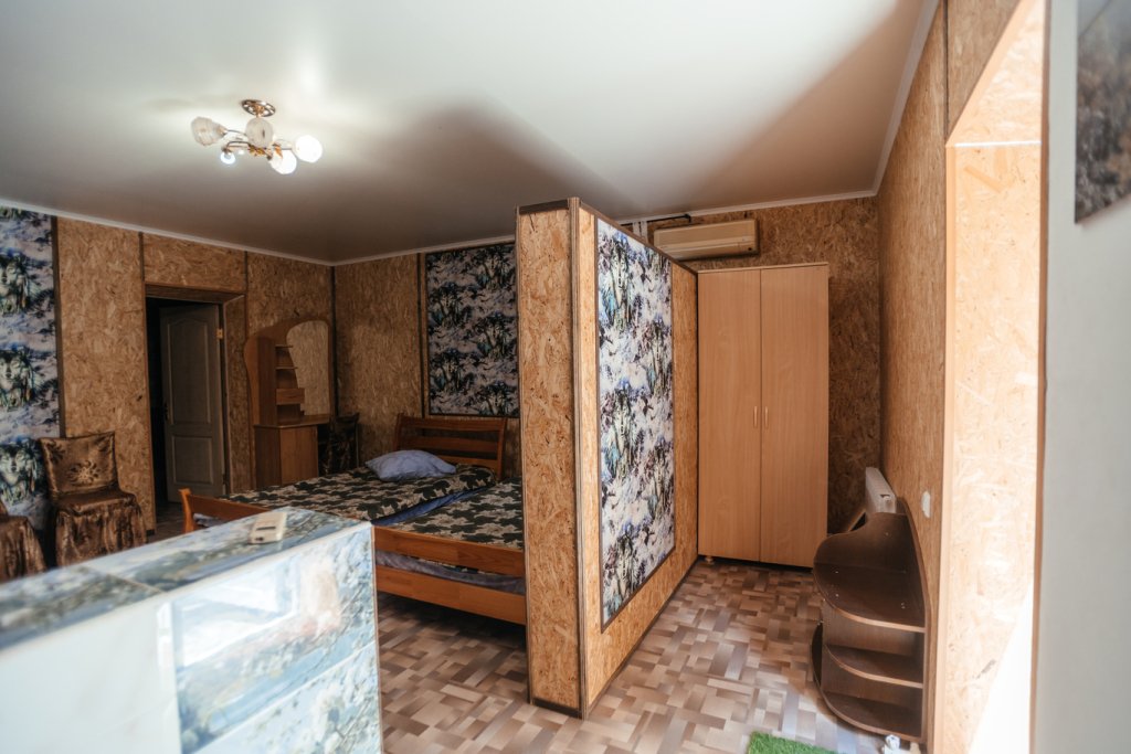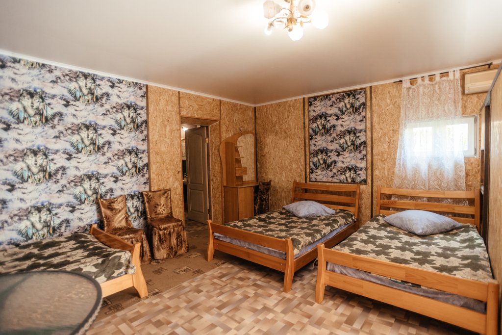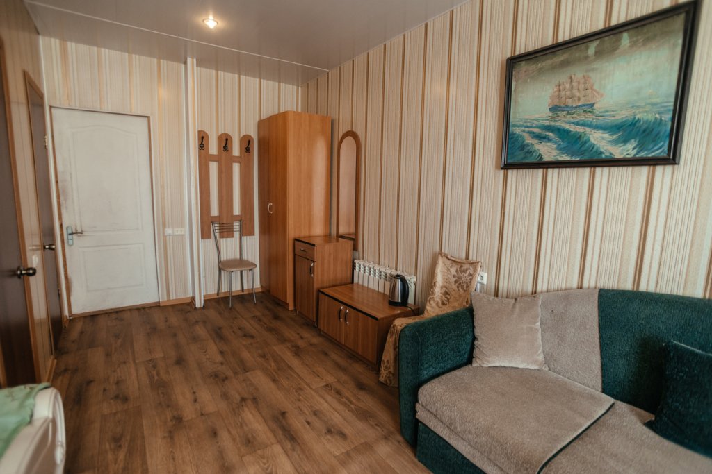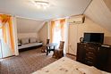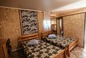 Четырехместный двухкомнатный просторный номер на втором этаже. В номере мини-кухня с холодильником, раковиной и чайником. В одной комнате - три односпальные кровати, во второй комнате - две полутороспальные кровати и полутороспальный диван. Каждая из комнат оснащена сплит-системой. В номере индивидуальный санузел, телевизор.