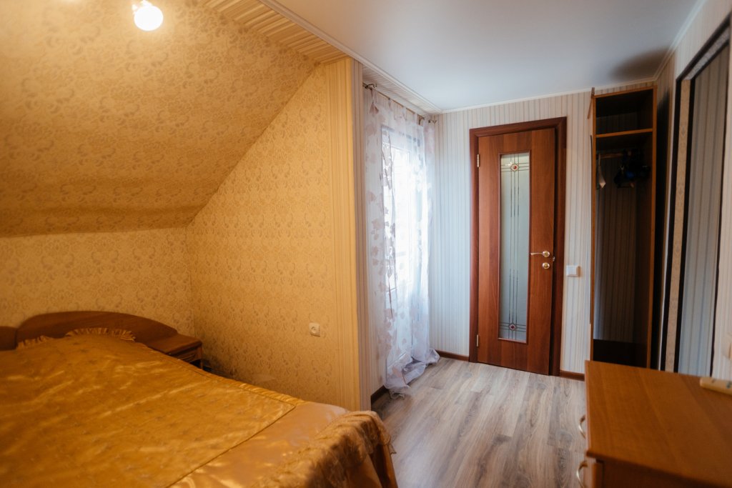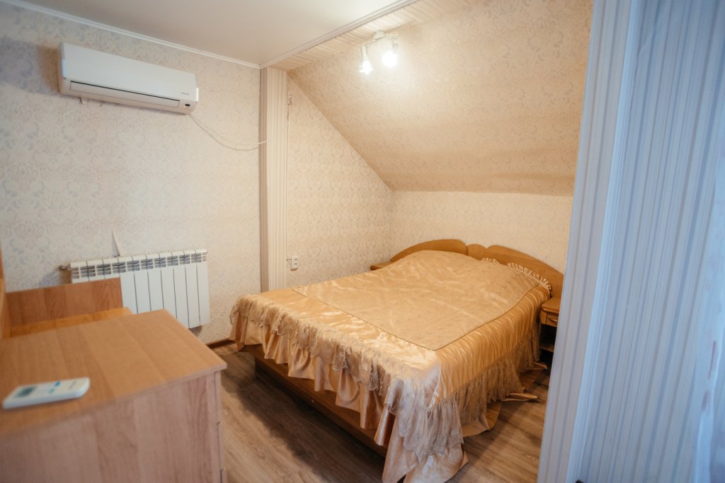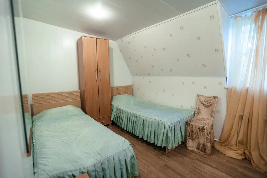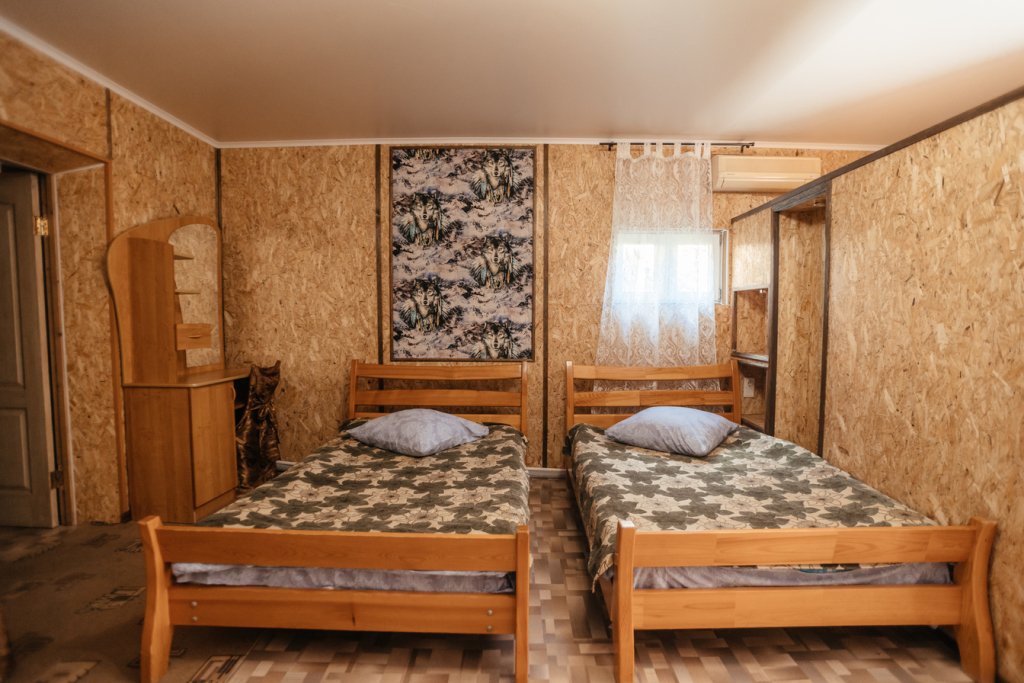 Двухэтажный просторный дом с баней на дровах (оплачивается дополнительно). В доме на первом этаже расположена столовая, баня и санузел. На втором этаже две спальные комнаты с общим холлом и балконом. В доме всего четыре односпальные кровати и два двуспальных раскладных дивана. В каждой комнате сплит-система. Дом оснащен холодильником, телевизором, чайником. Идеально подходит для большой семьи.