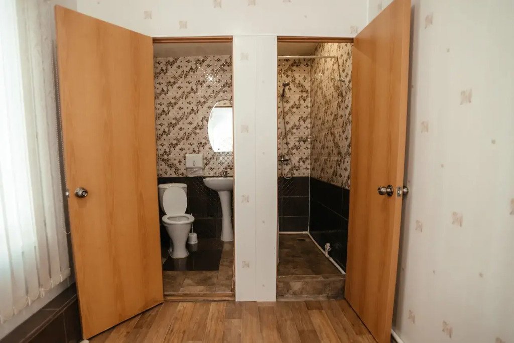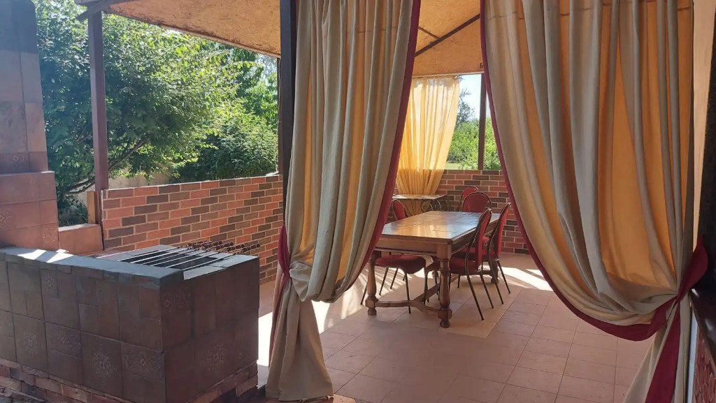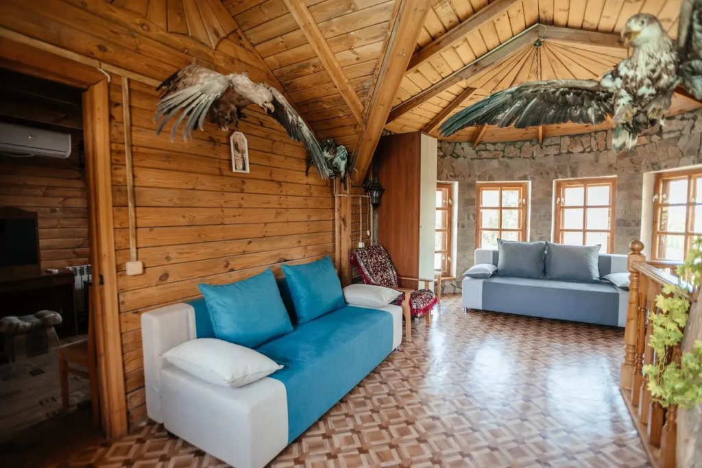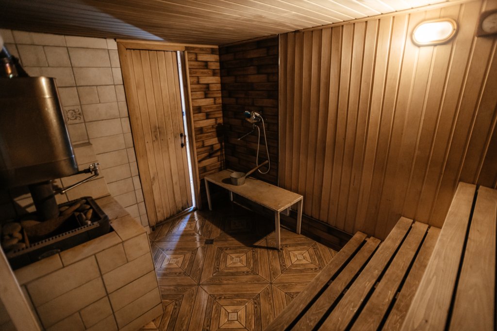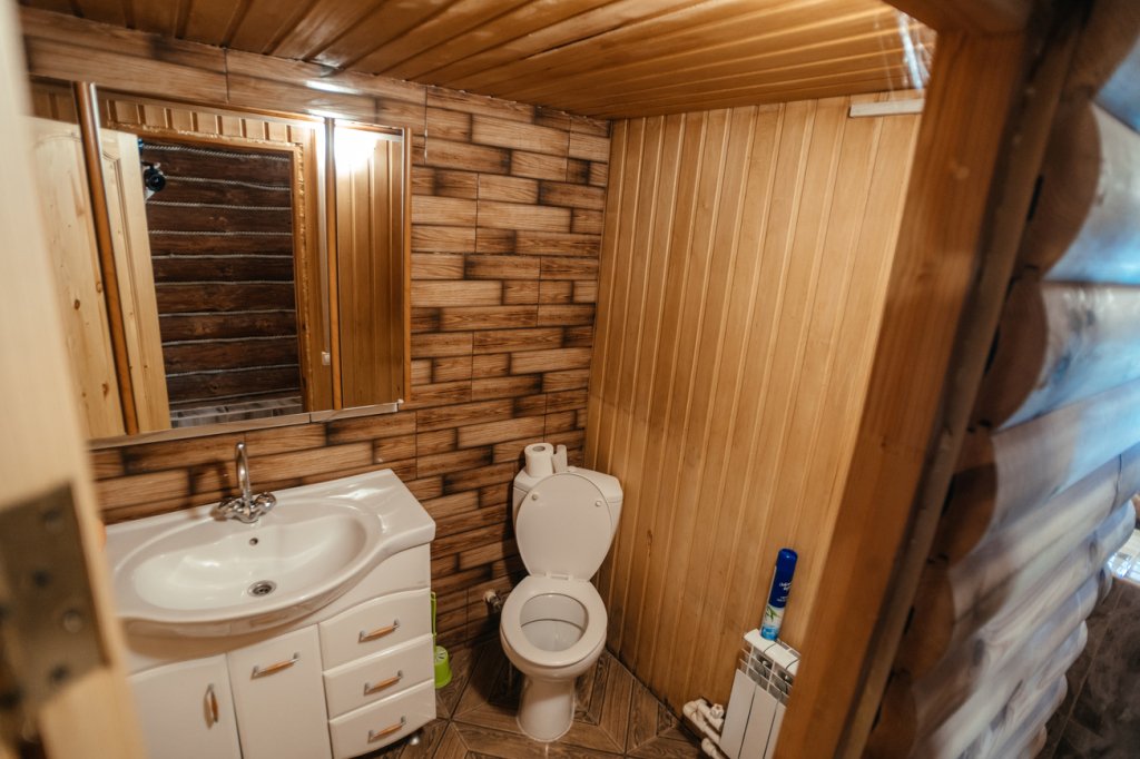 Двухэтажный просторный дом с баней на дровах (оплачивается дополнительно). В доме на первом этаже расположена столовая, баня и санузел. На втором этаже две спальные комнаты с общим холлом и балконом. В доме всего четыре односпальные кровати и два двуспальных раскладных дивана. В каждой комнате сплит-система. Дом оснащен холодильником, телевизором, чайником. Идеально подходит для большой семьи.