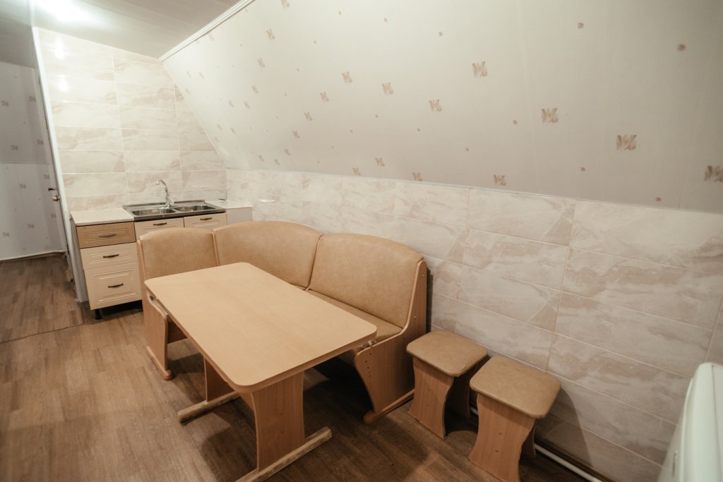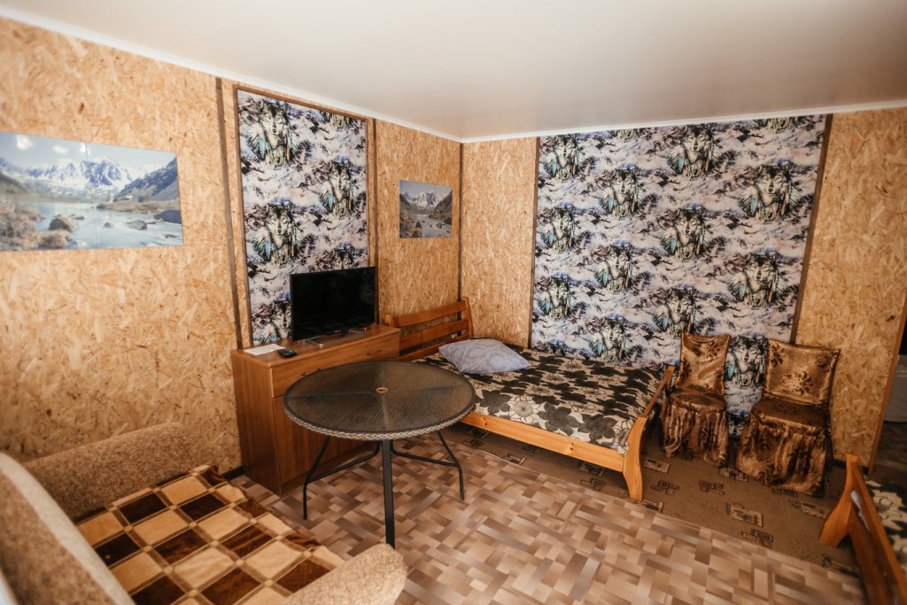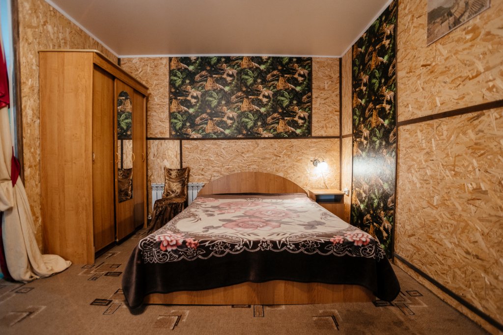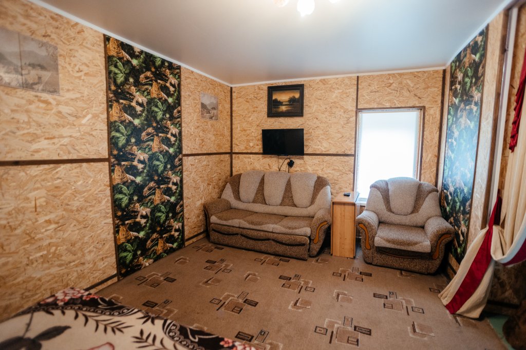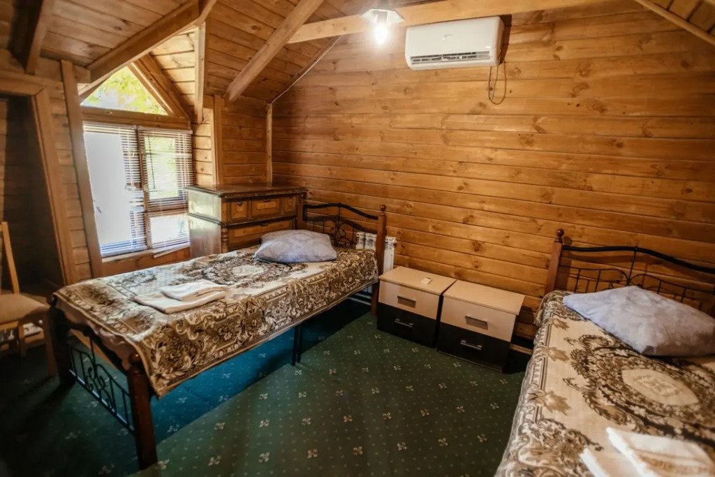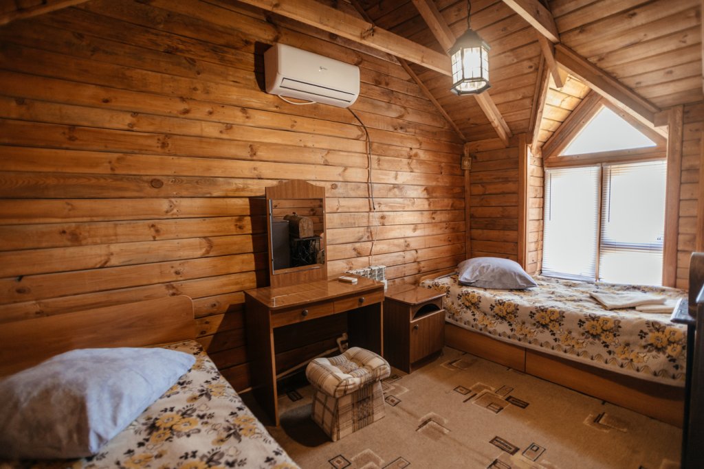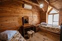 Двухместный просторный номер в доме из натурального дерева с одной двуспальной кроватью и раскладным двуспальным диваном. В номере индивидуальный санузел, сплит-система. Номер оснащен холодильником, телевизором, чайником. Идеально подходит для семьи.