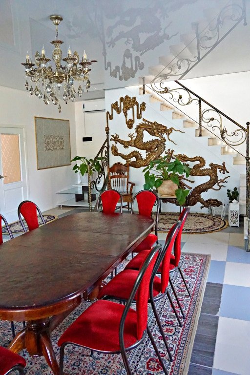 Второй этаж двухэтажного просторного дома. На этаже два двухкомнатных номера и общая лаундж-зона. В каждом двухкомнатном номере: в одной комнате двуспальная кровать и двуспальный диван, во второй комнате односпальная кровать. В каждой комнате индивидуальная сплит-система. На каждый номер индивидуальный санузел. В общем на этаже две двуспальные кровати, две односпальные кровати и два двуспальных дивана. В холле - диван, обеденная зона, микроволновая печь, холодильник, телевизор, чайник. Идеально подходит для большой семьи.