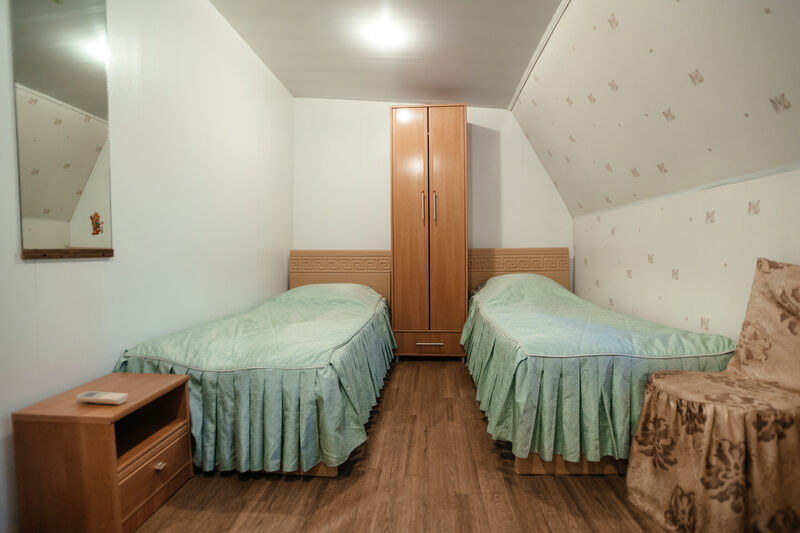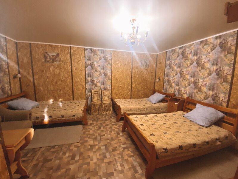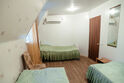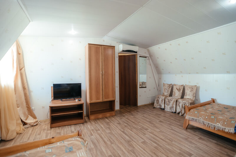 Трехместный просторный номер с одной двуспальной кроватью и двумя односпальными кроватями. В номере индивидуальный санузел, сплит-система. Номер оснащен холодильником, телевизором, чайником.