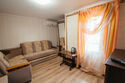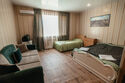 Четырехместный просторный номер с тремя полутороспальными кроватями и раскладным полутороспальным диваном. В номере индивидуальный санузел, сплит-система. Номер оснащен холодильником, телевизором, чайником, микроволновой печью.