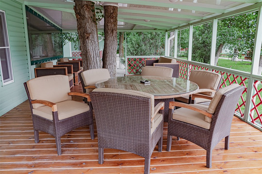 В доме: терраса, стол, стулья, диван, кресла, телевизор, 2 односпальные кровати, шкаф, вешалки, санузел с душевой кабиной, туалетные принадлежности,