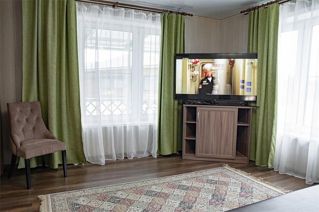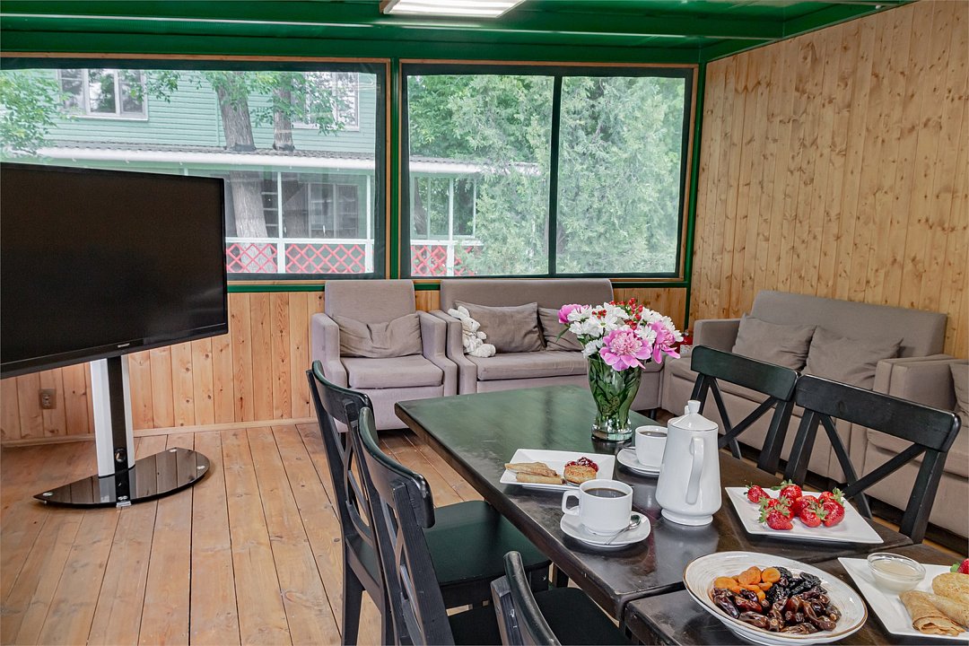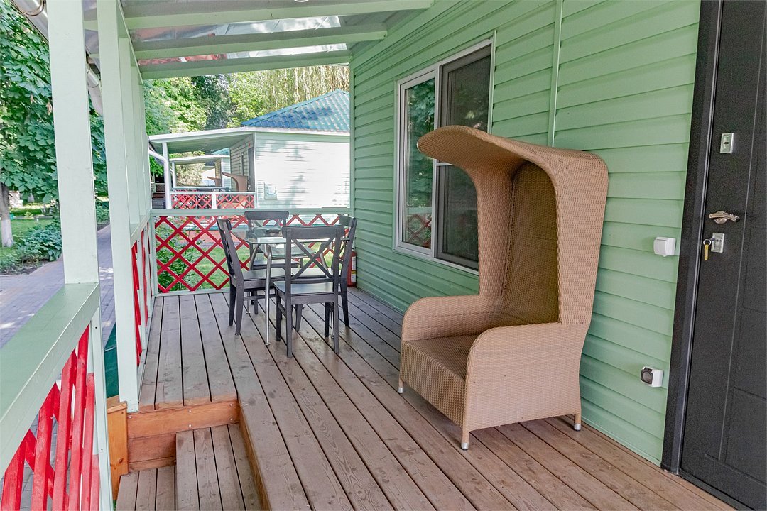 Студия (60 кв м) – это просторная комната, прихожая, теплая веранда-гостиная, санузел. В комнате могут быть 2 раздельные или 1 двуспальная кровати на выбор гостей.