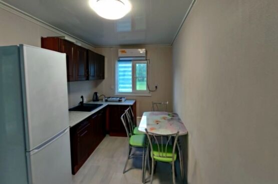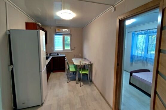 Коттедж рассчитан для проживания четырех человек на основных местах (+ одно доп. место - раскладная кровать). Включает в себя: одну спальню, кухню, санузел и беседку. В спальне вы найдете три просторные 1.5 спальные кровати, диван-книжку, прикроватные тумбочки, комод, вешалки, мебельный сейф, сплит-систему, телевизор, спутниковый ресивер. В кухне – кухонный гарнитур, мягкий уголок, с табуретками, обеденный стол, холодильник двухкамерный, газовая плита, чайник, набор посуды, полотенце, средства для мытья. В санузле - горячую и холодную воду, душевую кабину, раковину с зеркалом, полотенца для рук, туалетную бумагу, жидкое мыло и освежитель воздуха.