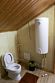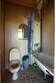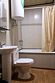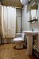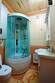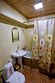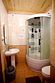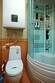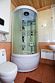 В ванной комнате: туалет, раковина, душевая кабина, фен.