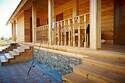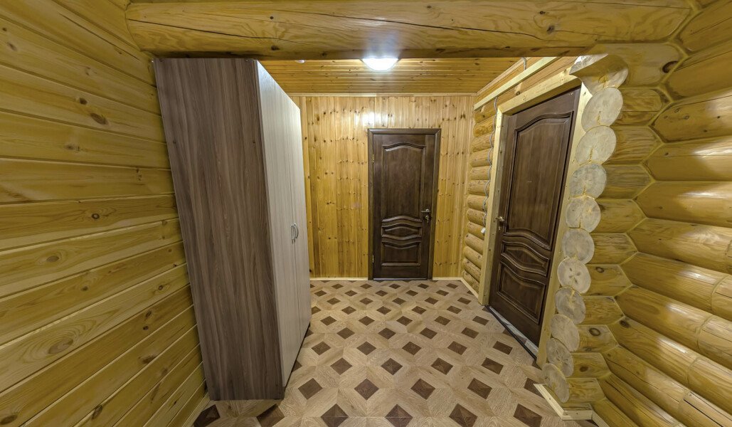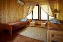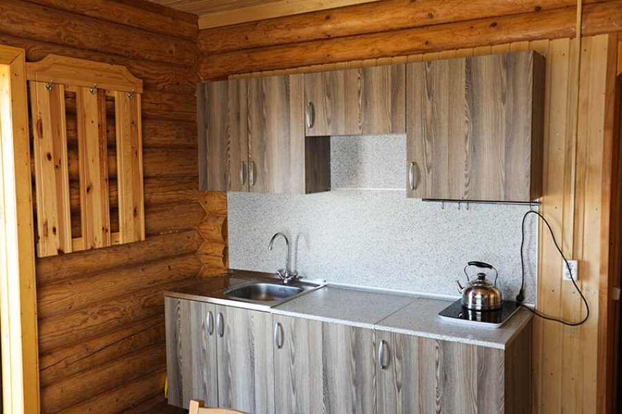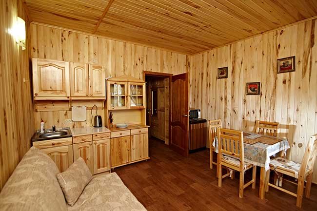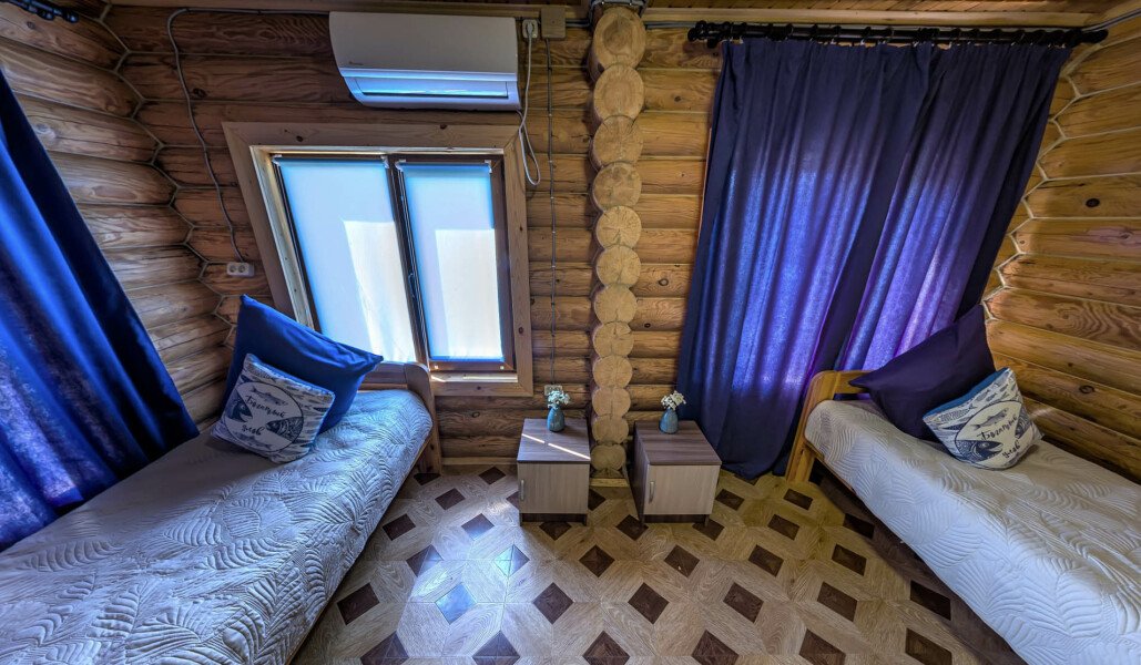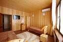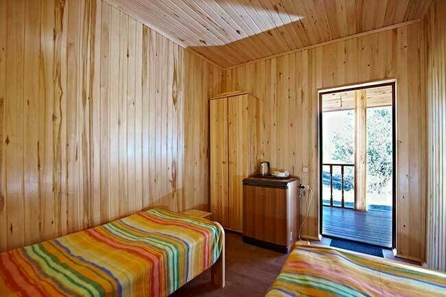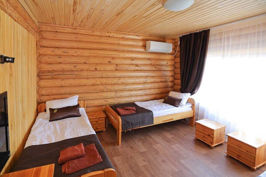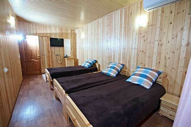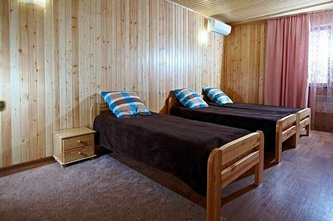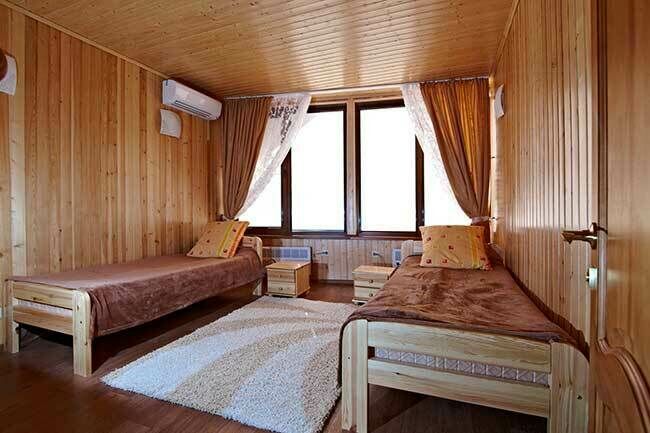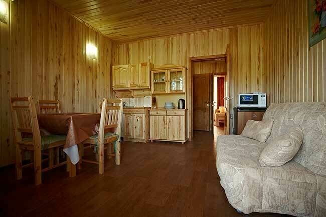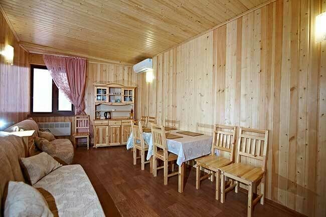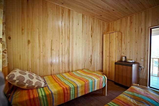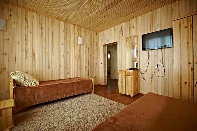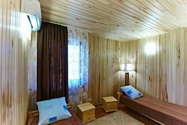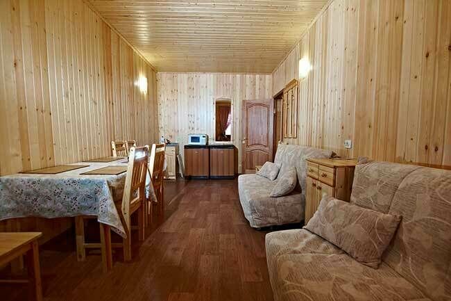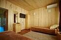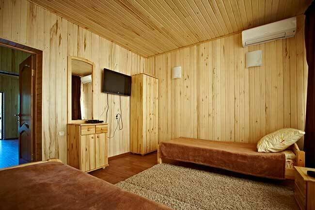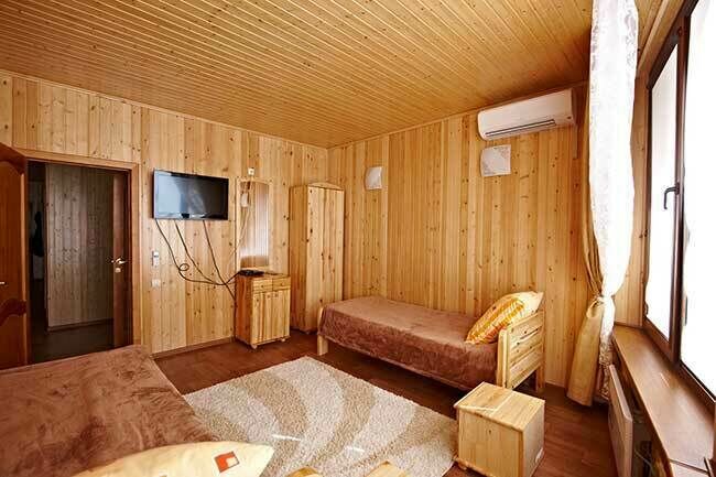 В доме: два номера площадью 16 м2 с панорамным остеклением, один номер площадью 14 м2, общая гостиная, две ванные комнаты.