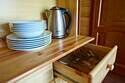 В гостинной: диван, кондиционер, обеденный стол, кухонный уголок, холодильник, микроволновая печь, электрический чайник, комплект посуды.