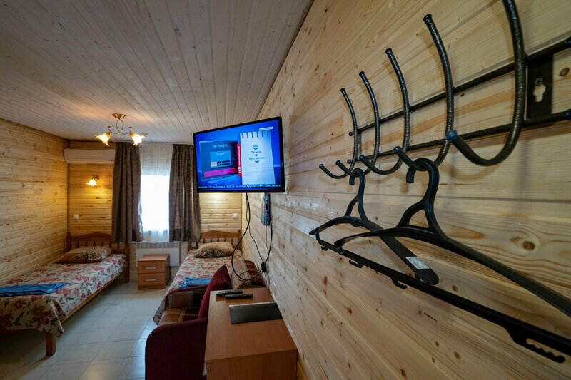 В комнате расположены две односпальные кровати, прикроватная тумбочка, комод, полка, обеденный стол, стулья, вешалка для одежды, LED-телевизор, холодильник, сплит-система, электрический чайник, набор столовой посуды.