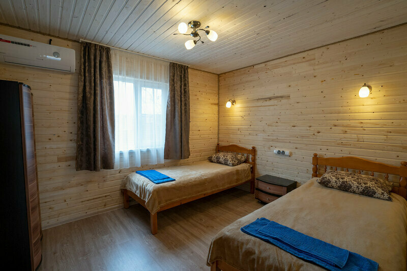 В каждой спальне: две односпальные кровати, прикроватная тумбочка, комод, сплит-система, вешалка для одежды.