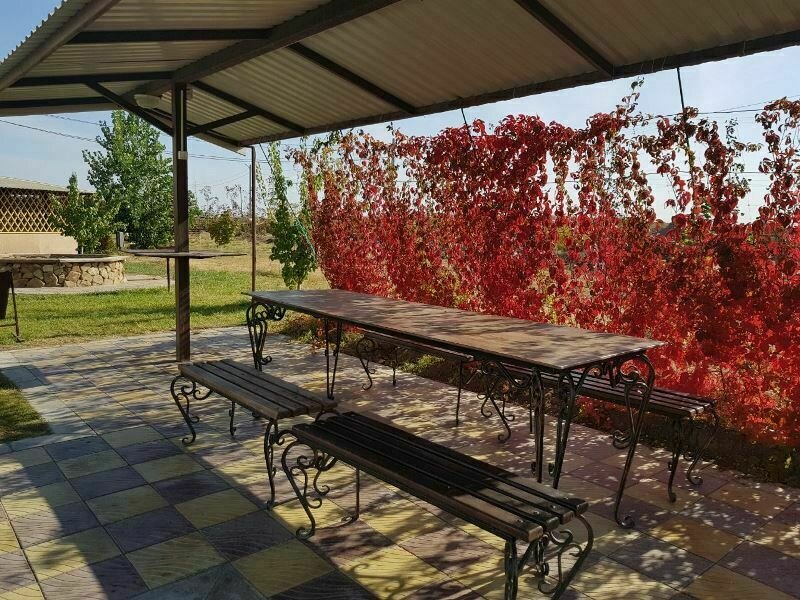 В беседке: москитная сетка, стол и скамья для приятного отдыха.