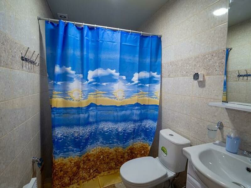 В санузле: туалет, душ, раковина, полотенца, мыло.