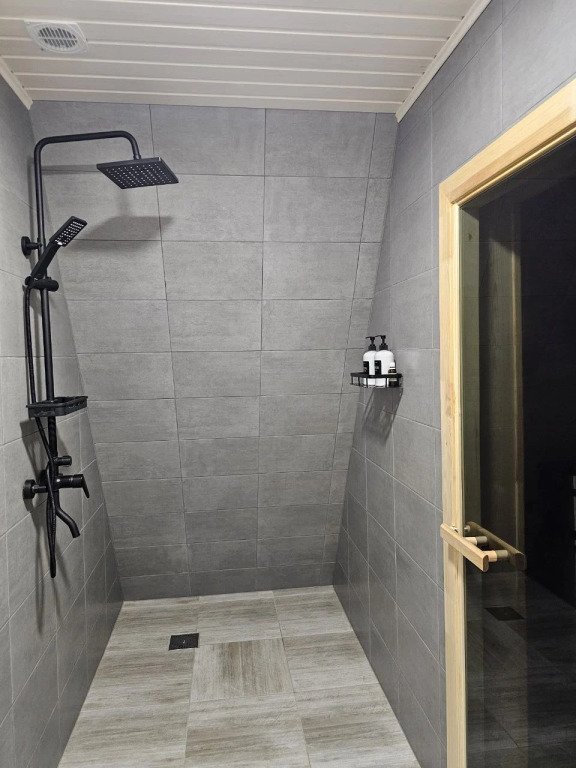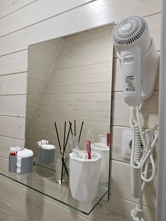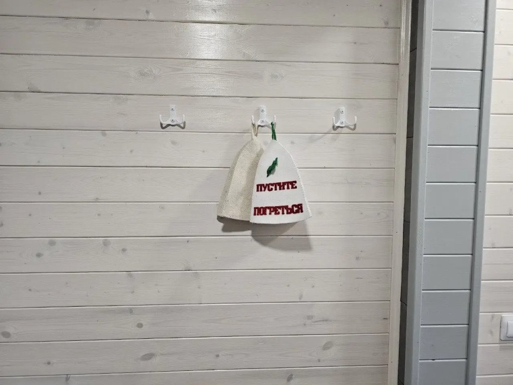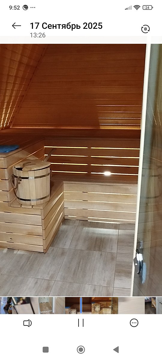 В сауне установлена электрическая печь с эффектом «Русской бани», поэтому можно подливать воду в квадратный испаритель, расположенный в центре каменки. Также можно добавлять ароматические масла, которые стоят на полочке в душевом помещении.