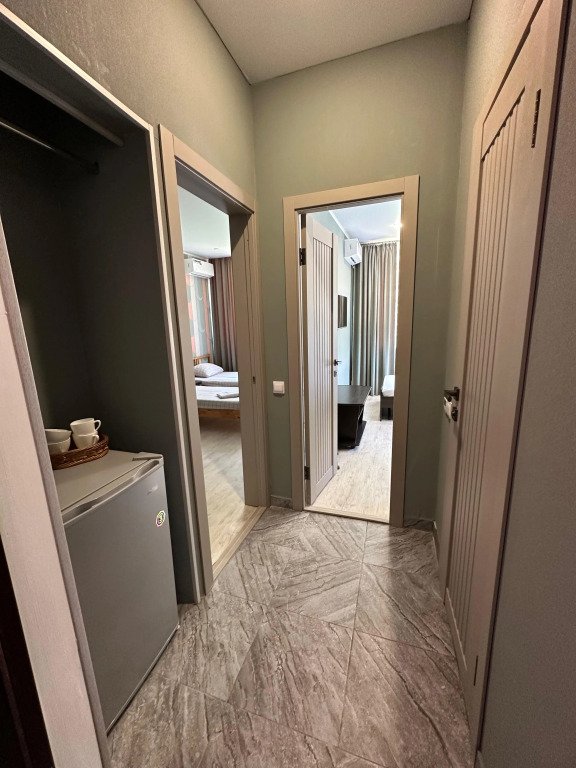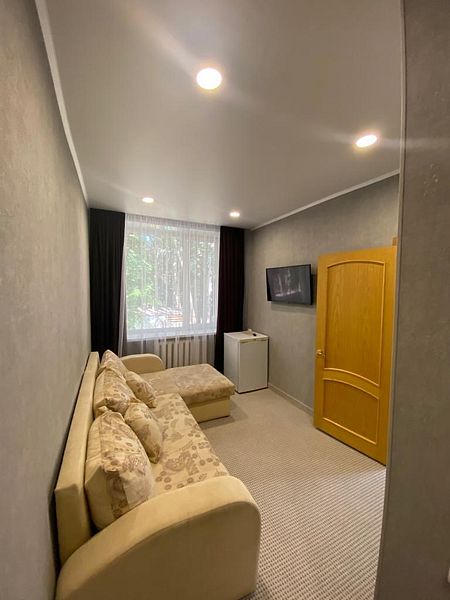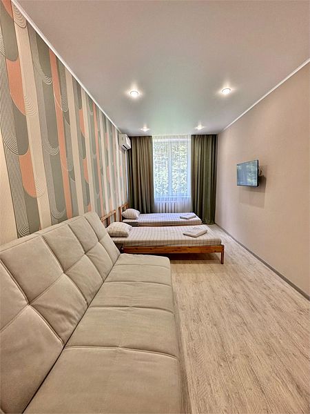 В номере: две односпальные кровати, раскладывающийся диван, кондиционер, холодильник, чайник, комплект посуды.