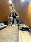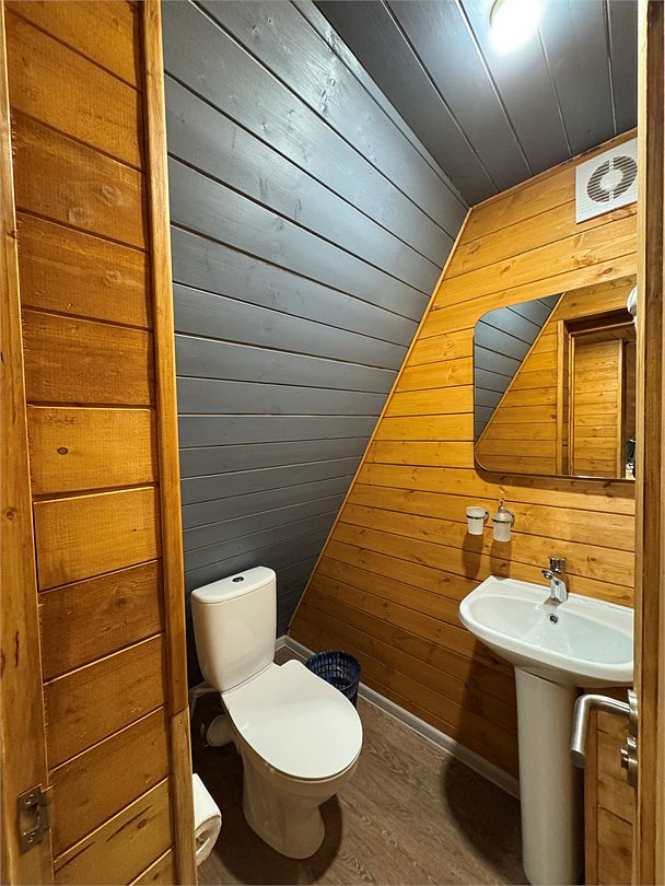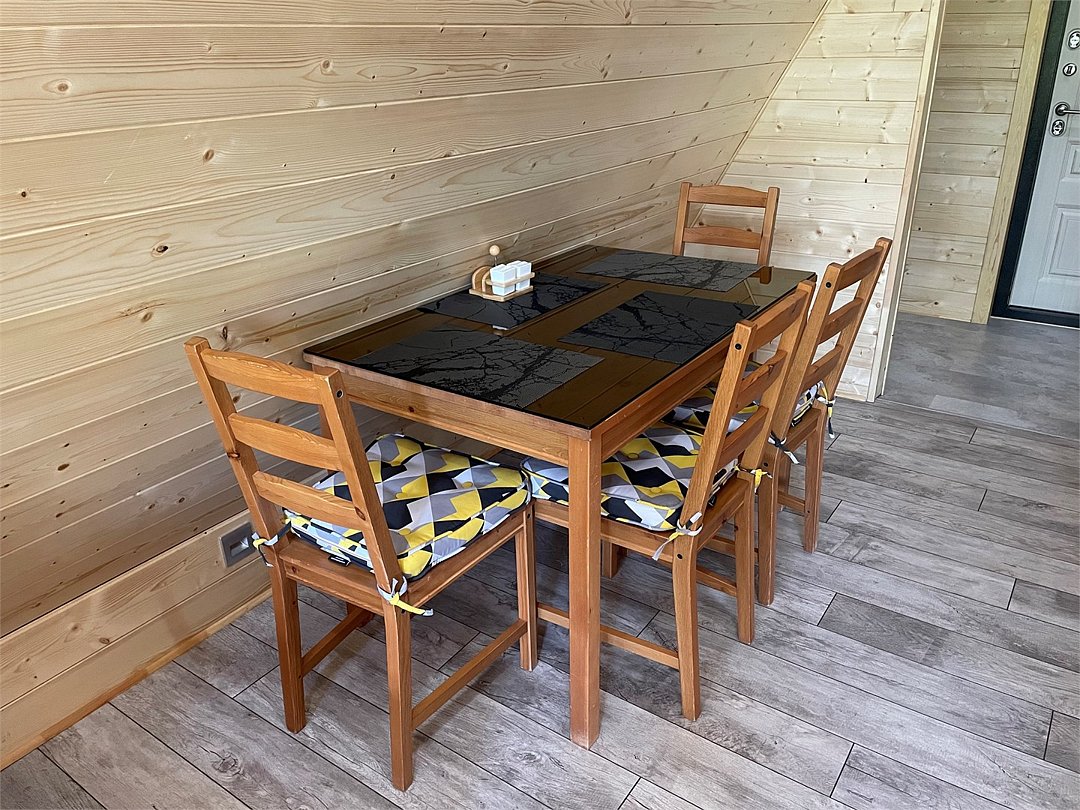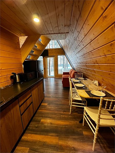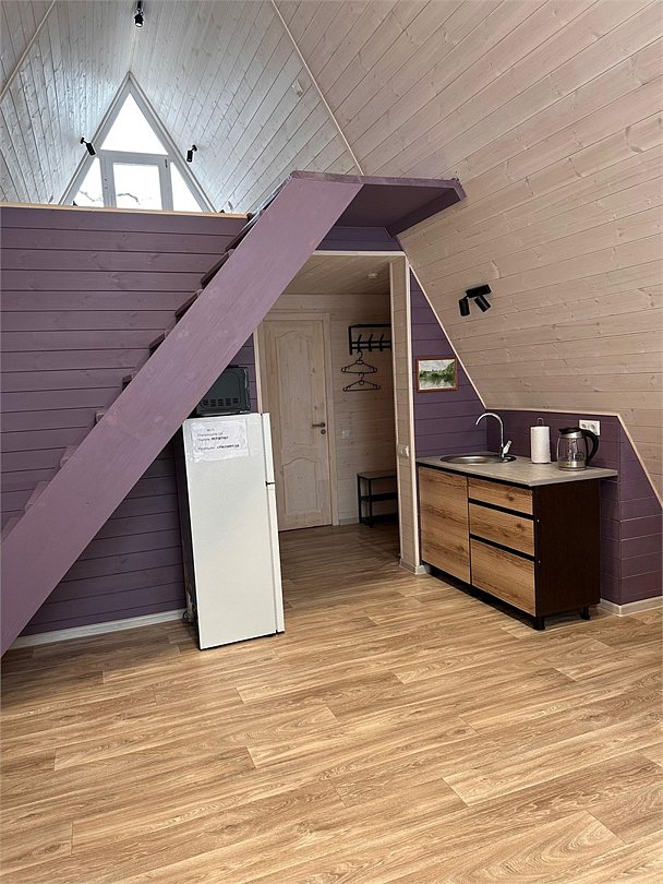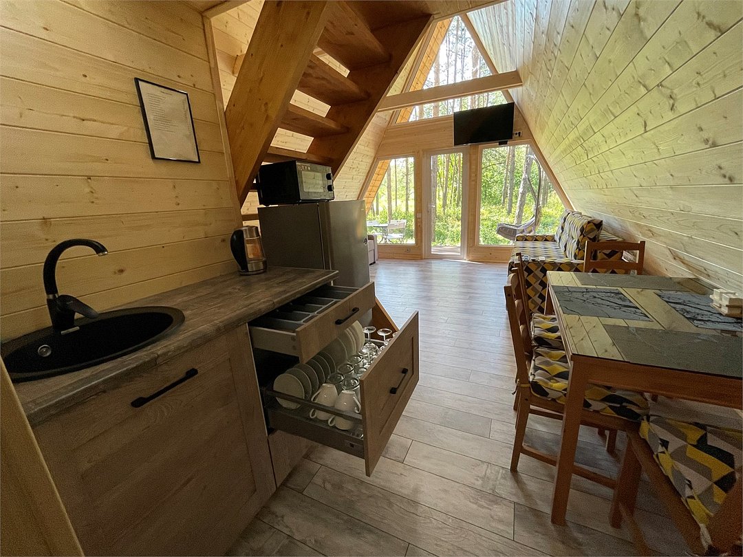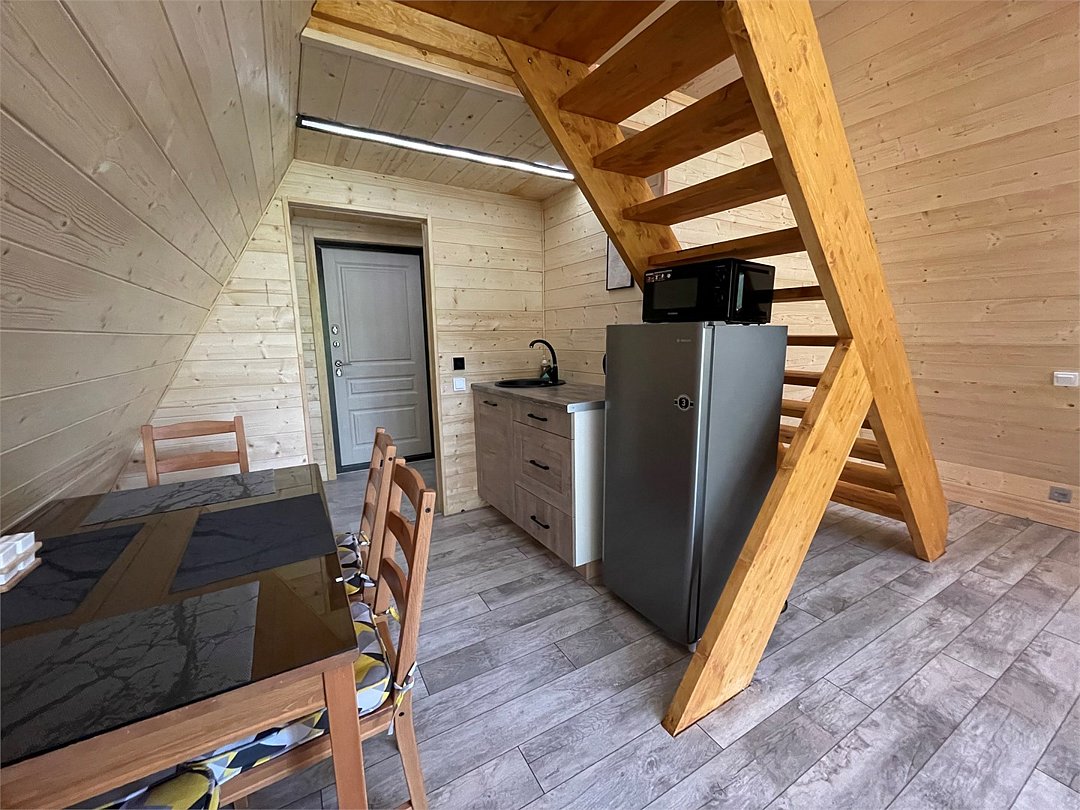 Второй этаж оборудован просторной гостиной с уютной зоной для трапез, удобными столами и скамейками. Здесь также имеется кухонная зона с микроволновой печью, холодильником и кухонными принадлежностями, а для развлечений предусмотрен телевизор.