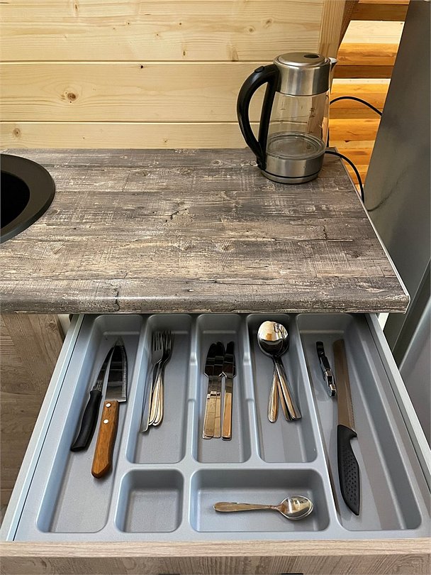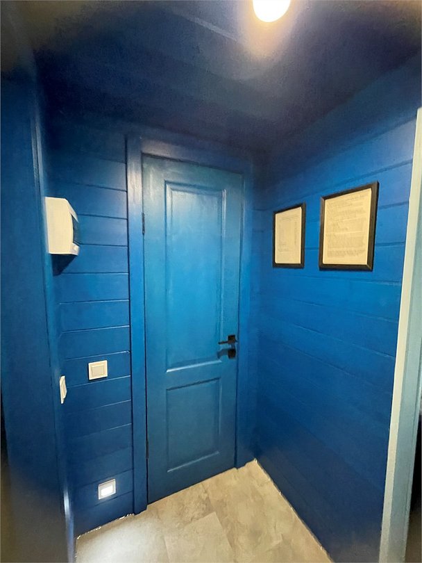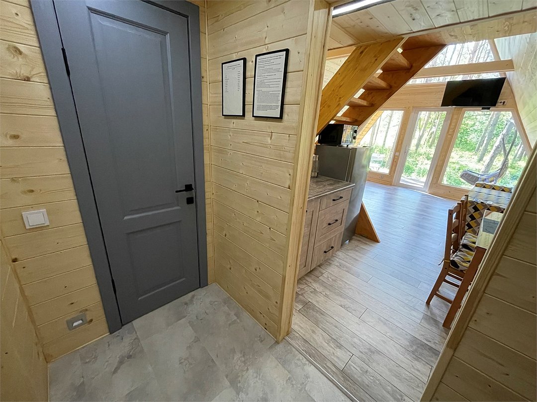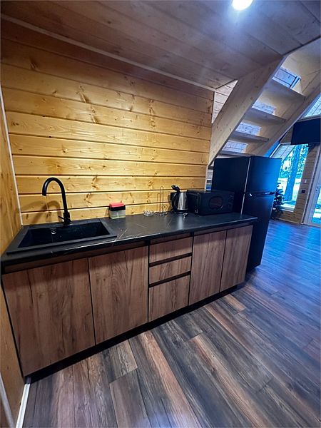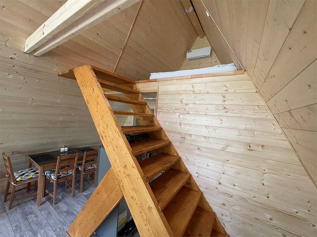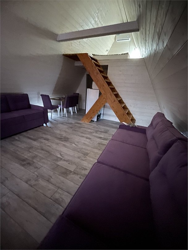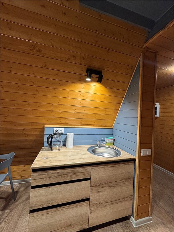 Второй этаж оборудован просторной гостиной с уютной зоной для трапез, удобными столами и скамейками. Здесь также имеется кухонная зона с микроволновой печью, холодильником и кухонными принадлежностями, а для развлечений предусмотрен телевизор.