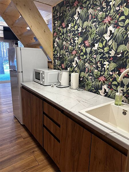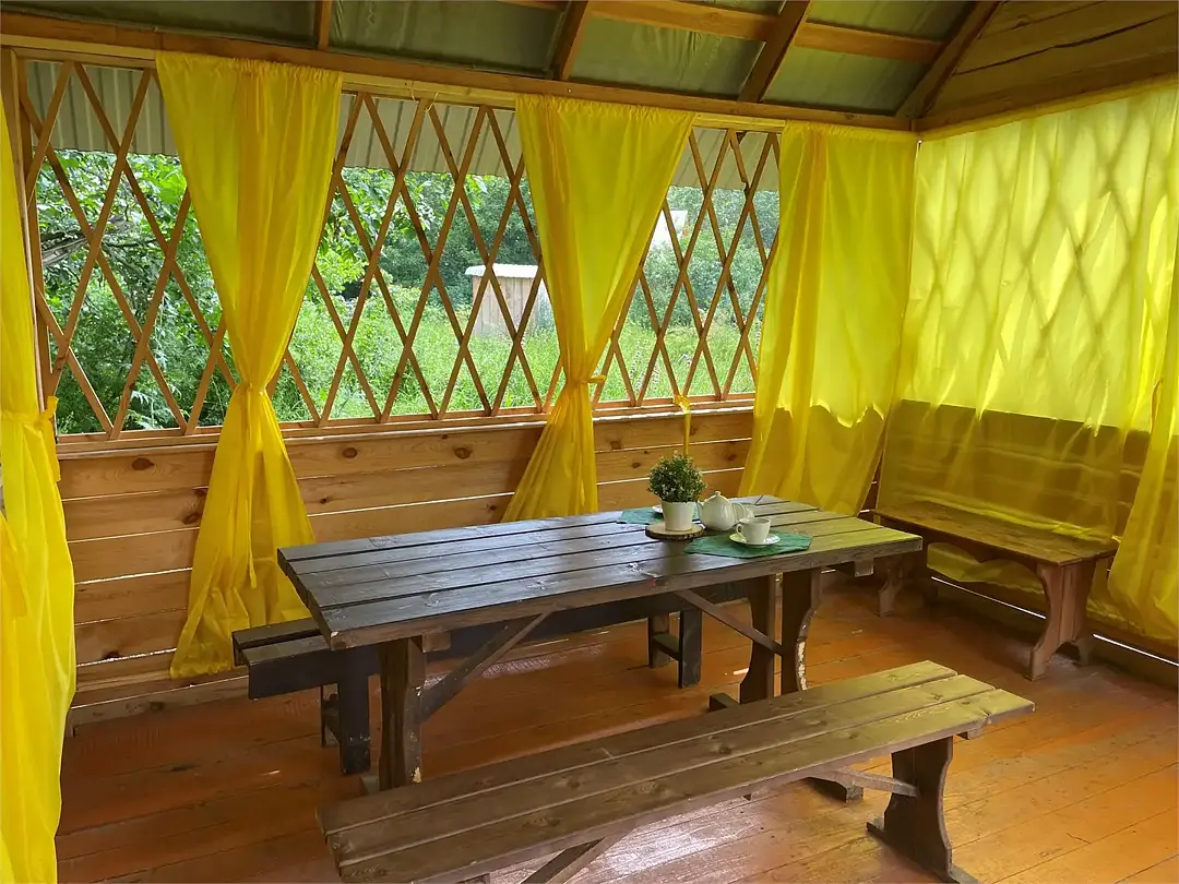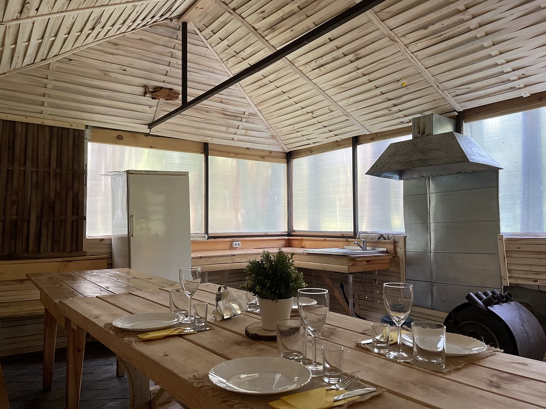 Беседка рассчитана на одновременное пребывание до двадцати человек. Внутри есть стол, стулья, холодильник и кухонная зона с раковиной. В холодное время года помещение можно обогреть печкой, что создает комфортные условия.
